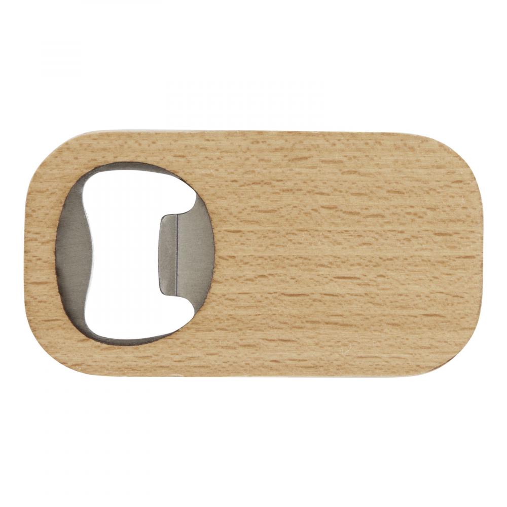 Открывашка для бутылок из нержавеющей стали с деревянной поверхностью.