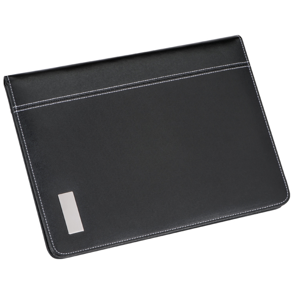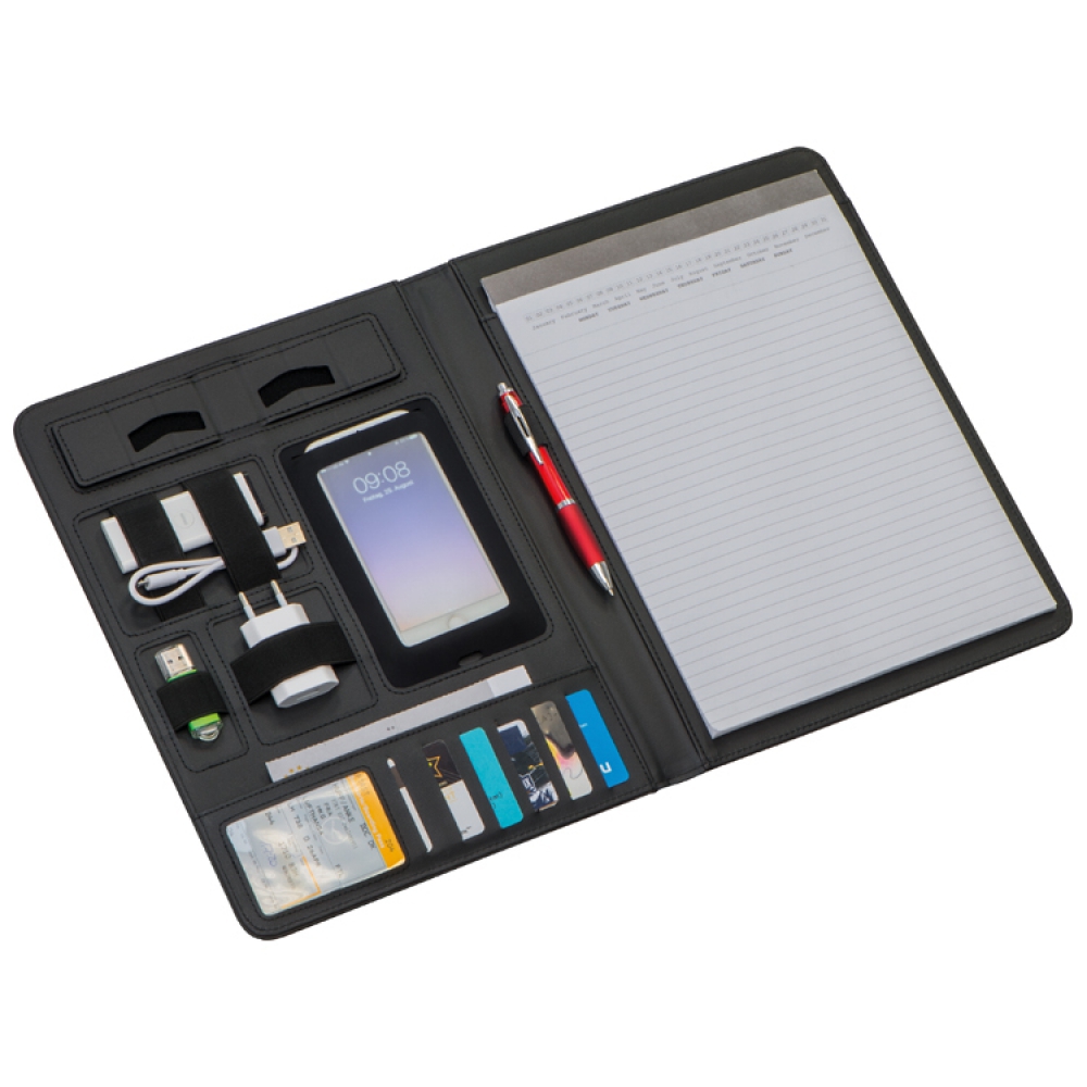Папка для конференций в формате А4, изготовлена из высококачественной кожи. Имеет практичные карманы для визитных карточек, телефона и место для ручек, а также блокнот в линию с небольшим календарем. Логотип можно поместить на металлической пластинке.