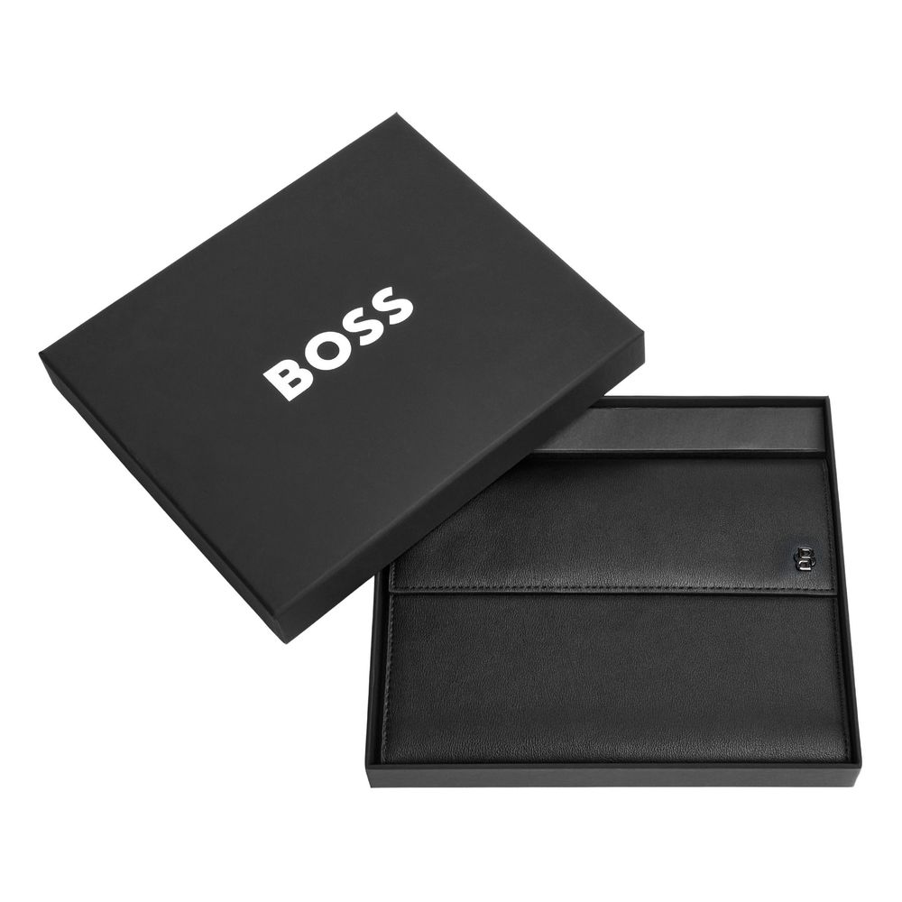 Эта папка для записей формата A5 от BOSS является идеальным минималистичным аксессуаром. Изготовленная из мягкой, текстурированной матовой черной PU ткани, она оснащена новой мини-версией пластины Double B и блестящей металлической пластиной с покрытием "под оружейную сталь". Логотип BOSS тиснен на задней стороне, добавляя тонкий штрих роскоши. Разработанная для легкого сочетания с другими элементами коллекции для письма, эта папка предлагает как стиль, так и функциональность.