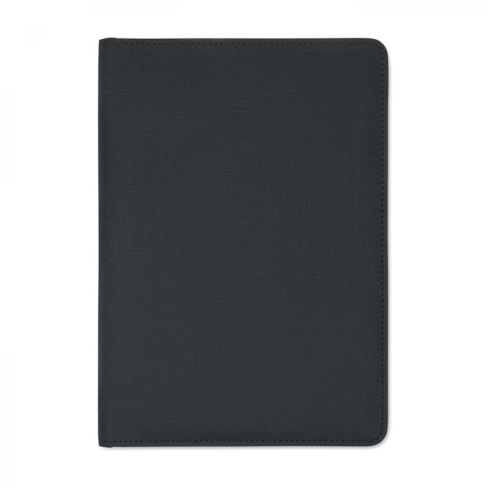 Папка для конференций A5 из 300D RPET. Включает сменный блокнот формата А5, 40 страниц белой линованной бумаги из бамбука (20 листов), держатель для ручки, отделения для карт с внутренней стороны и одно большое отделение.