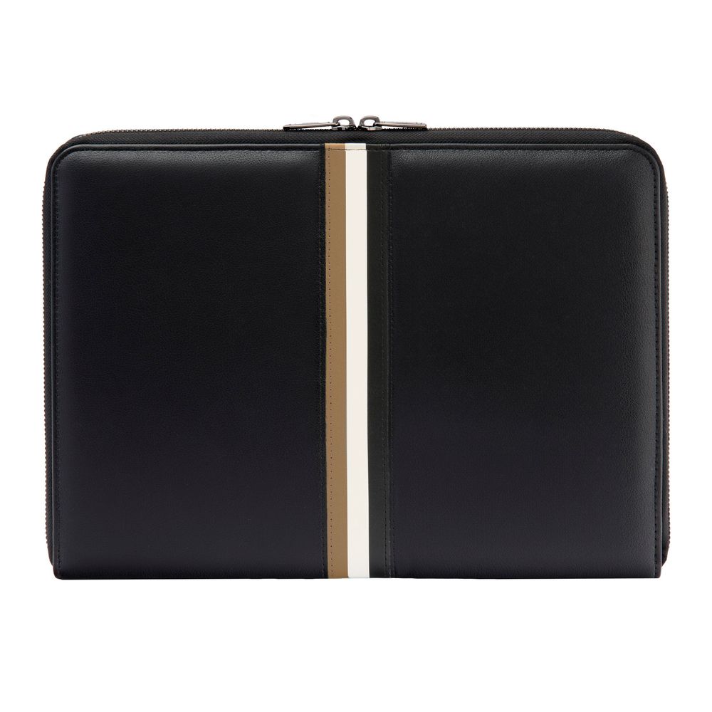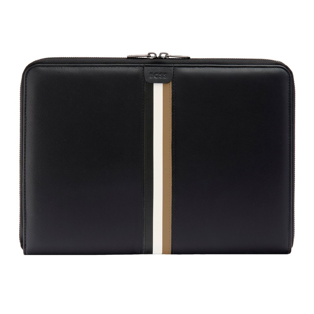 Эта папка формата A4 от BOSS сочетает в себе активный стиль с элементами роскоши. Изготовленная из гладкого, мягкого черного полиуретана, она украшена фирменной полосой из трех цветов в центре. Логотип BOSS роскошно выгравирован на бирке, расположенной в верхней части полосы, а металлические молнии с покрытием под оружейную сталь и логотипом BOSS придают изделию изысканность. Эта папка предназначена для поклонников бренда, предлагая стильный и функциональный способ организовать ваши документы.