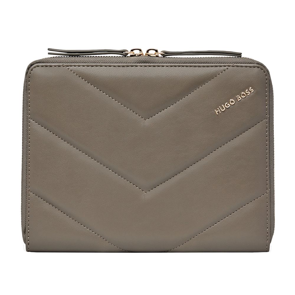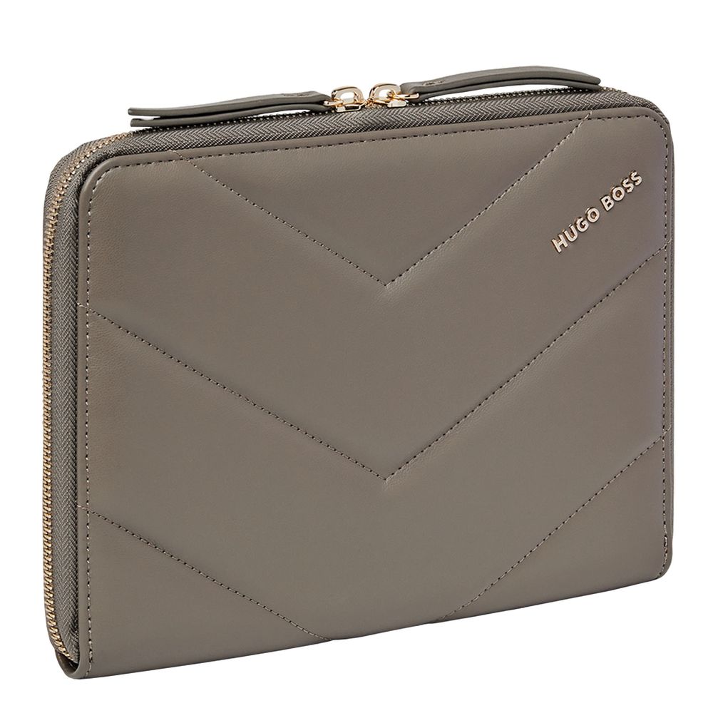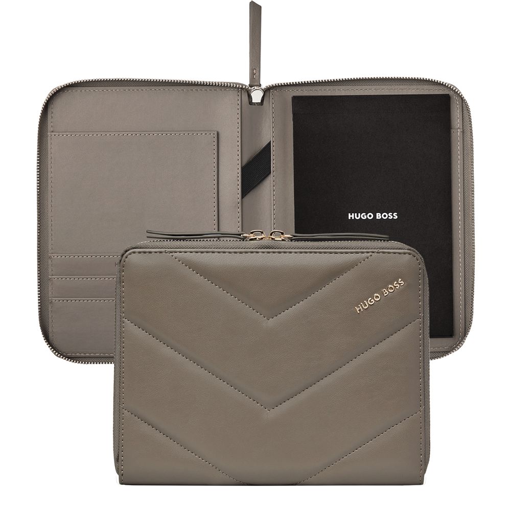 Женственные и элегантные папки Triga украшены роскошными золотыми акцентами и матовой текстурой из веганской кожи. Они подписаны красивой золотой табличкой с логотипом HUGO BOSS, а их поверхность украшена стеганым геометрическим и графическим узором, что делает их одновременно современными и женственными. Эта папка формата A5 доступна в трех роскошных и теплых тонах: черном, бежевом и цвете тауп. Она станет идеальным спутником на каждый день, позволяя делать заметки на бумажном блокноте, а также имеет вместительное внутреннее пространство для организации всех ваших документов. Линия "Triga" идеально подходит для сочетания и комбинирования в наборах, которые соответствуют вашему вкусу, создавая сдержанные, но изысканные подарочные наборы.
