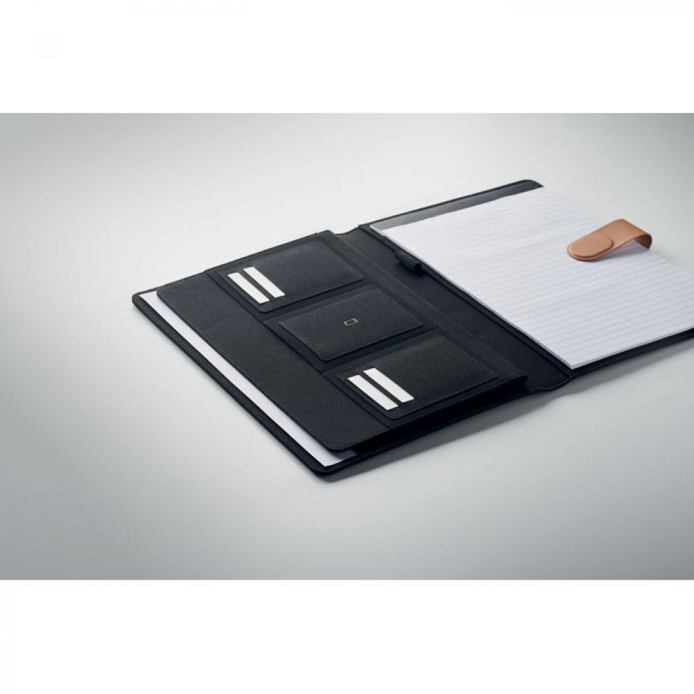 Папка А4 из RPET с деталями из искусственной кожи. Сменный блокнот формата А4. 30 линованных страниц из переработанной бумаги. Держатель для ручки. 4 держателя для визиток, 3 маленьких кармана и одно большое отделение. Ремешок с магнитной застежкой FSC®-certified | FSC MIX , P8.6, FSC-C213206