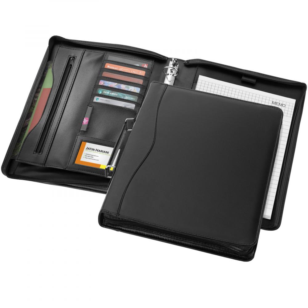 Идеальный предмет, с помощью которого каждый сотрудник косвенно способствует повышению узнаваемости любого бренда: портфолио Ebony. Портфолио формата A4 включает в себя удобный отсек и карман на молнии для хранения документов. Кроме того, в нем есть блокнот на 20 страниц в линейку и петля для ручки (ручка и аксессуары не включены). Закройте портфолио на молнию, чтобы содержимое оставалось аккуратным и хорошо защищенным. Портфолио изготовлено из прочной искусственной кожи и предоставляет достаточно места для крупных логотипов.