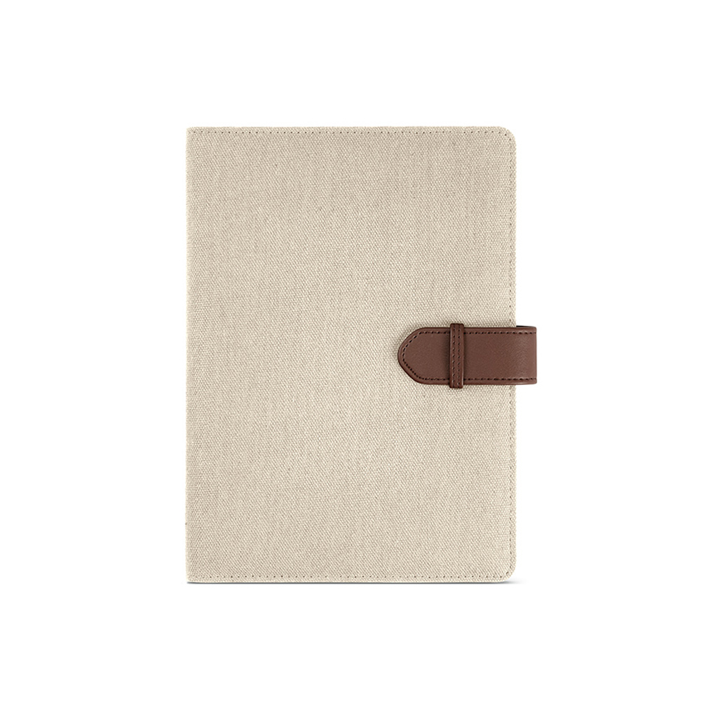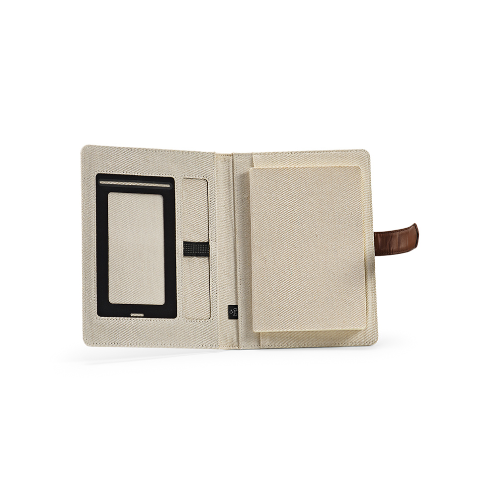 Наша экологичная папка формата A5 из переработанного хлопкового полотна оснащена удобной застежкой на кнопке из переработанного ПУ, блокнотом на 64 страницы в точку (70 г/м²), карманом для телефона, двойным держателем для ручек и слотами для карт. Создана с учетом устойчивости, она станет вашим стильным спутником на пути к успеху.