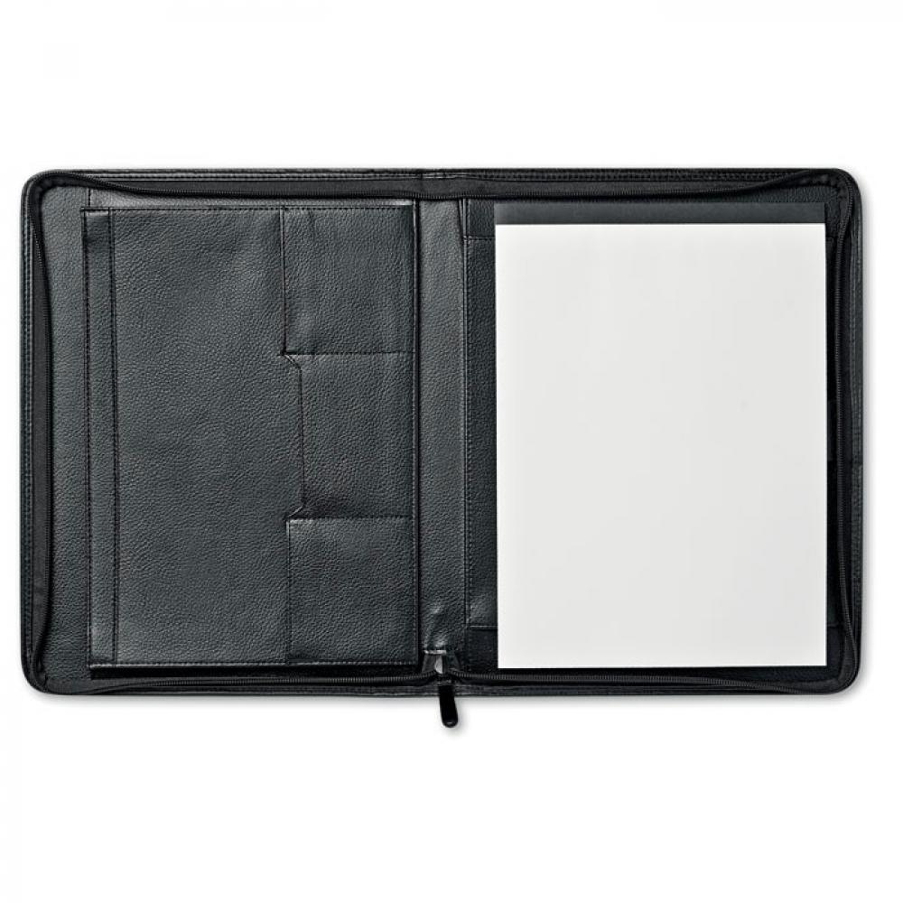 Папка формата А4 из искусственной кожи с внутренними карманами. Содержит блокнот с 25 нелинованными страницами