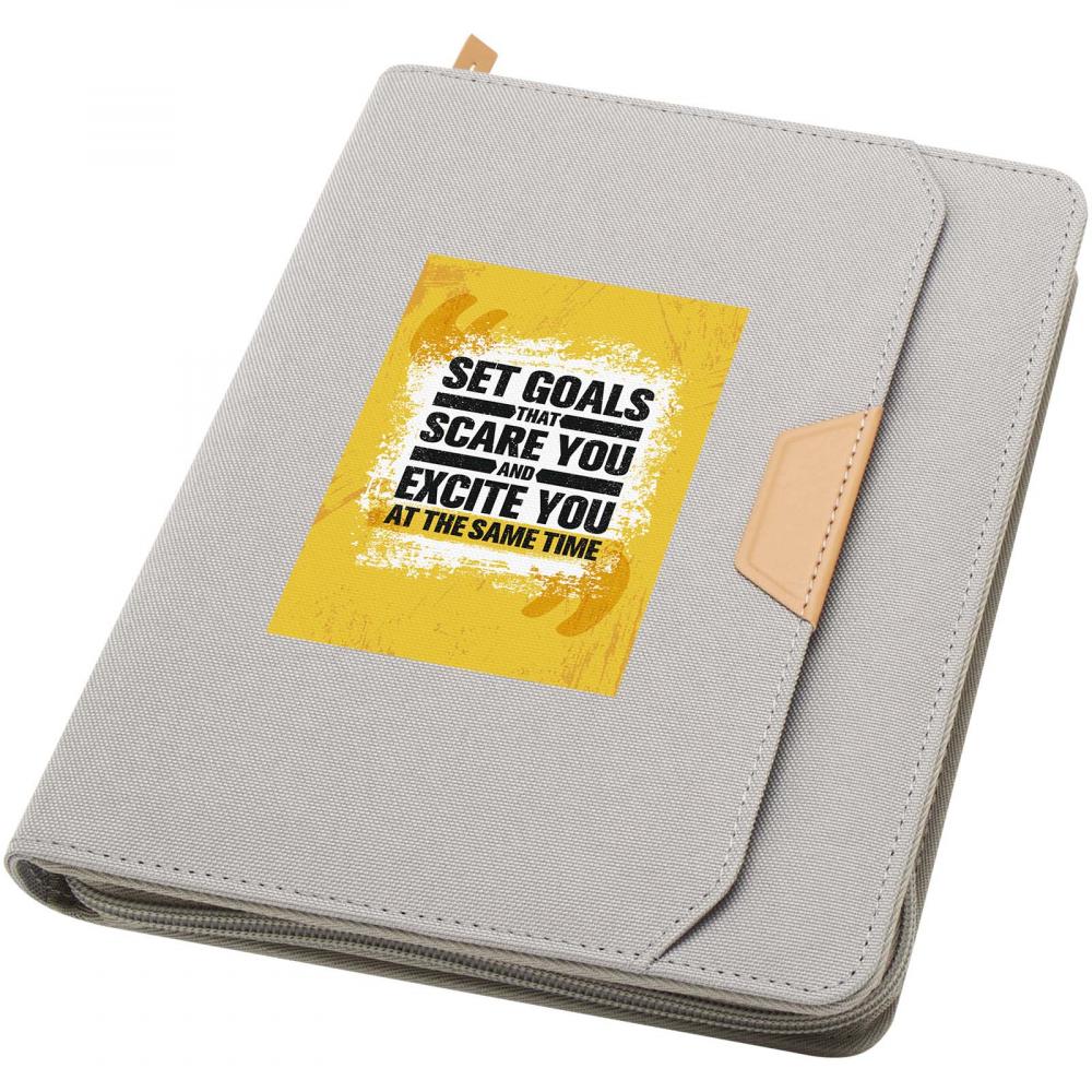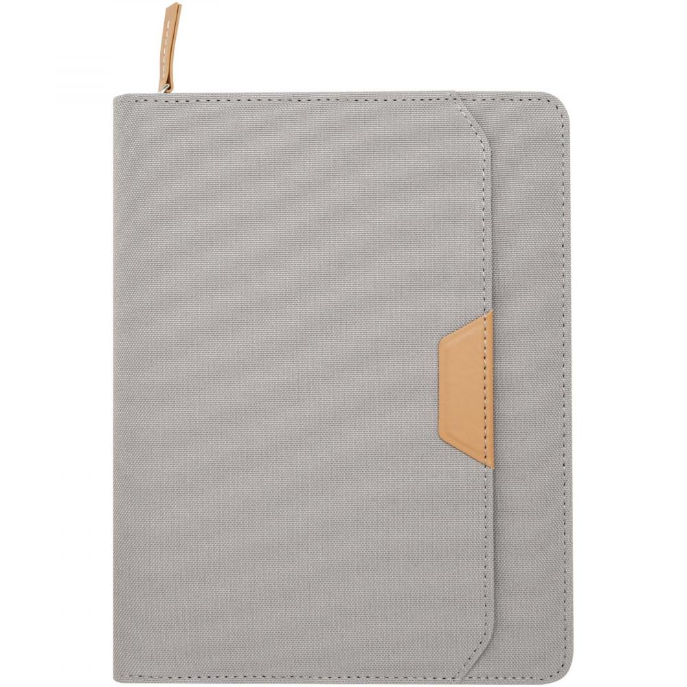 Папка Nomumi A5 с закругленными углами — это удобный офисный аксессуар, изготовленный из переработанного пластика. Включает 64 кремовых листа с линейкой плотностью 80 г/м2, застежку-молнию, петлю для ручки и карман-аккордеон.
