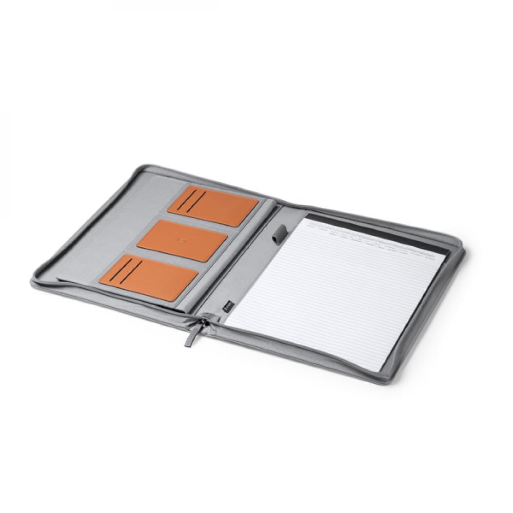 Многофункциональная папка формата A4 из 600D RPET и PU с застежкой-молнией. Внешний карман, несколько внутренних отделений и 4 отделения для карт. В комплекте держатель для ручки. 20-листовой съемный линейный блокнот.