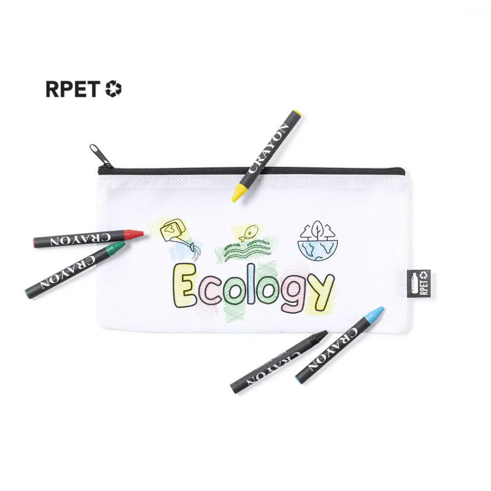 Особенности Чехол из нетканого материала RPET белого цвета, с застежкой на молнию и металлическим съемником. Специально разработан для раскрашивания мелками. В том числе 5 цветных карандашей разных цветов. Внешняя этикетка с отличительным знаком RPET. В комплекте 5 цветных карандашей Нетканый RPET
