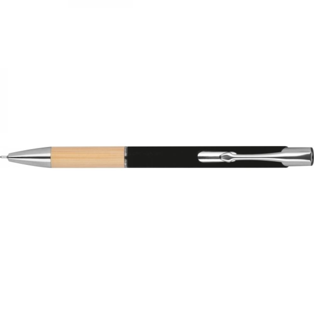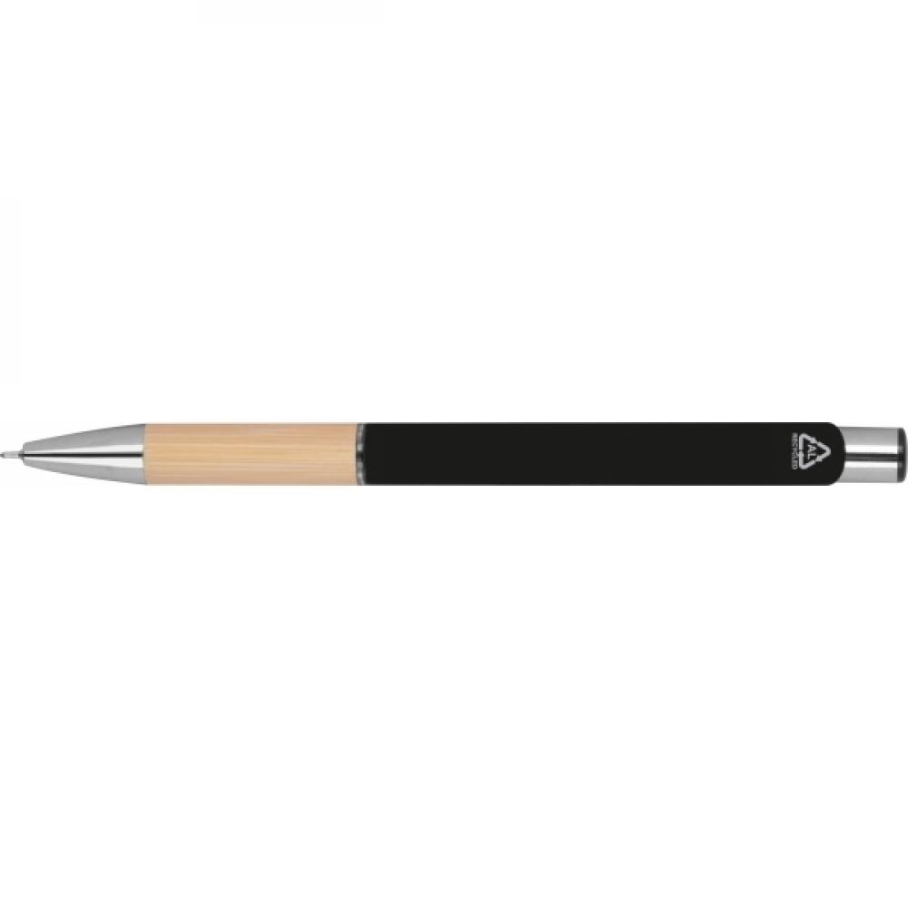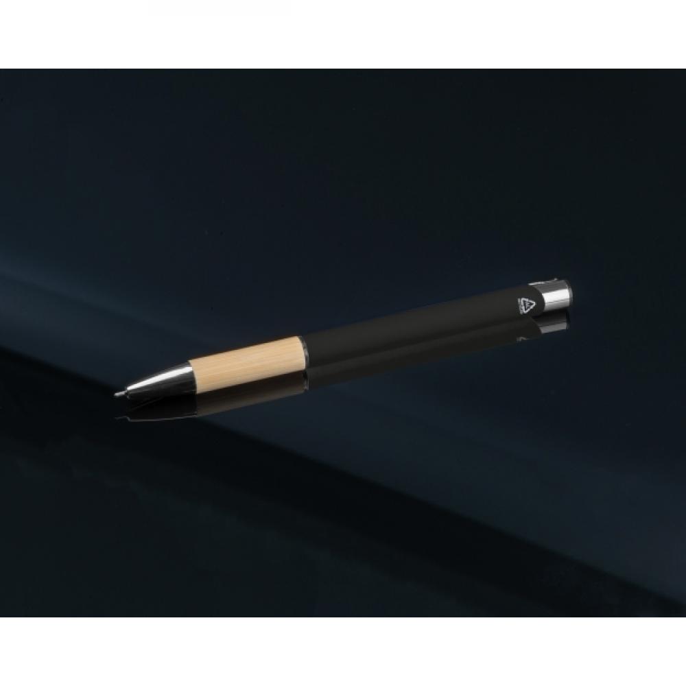 Полугелевая ручка из переработанного алюминия с резиновым покрытием. Она также имеет зону хвата из бамбука, синий пластиковый стержень для письма (0,5 мм), и серебряные акценты.