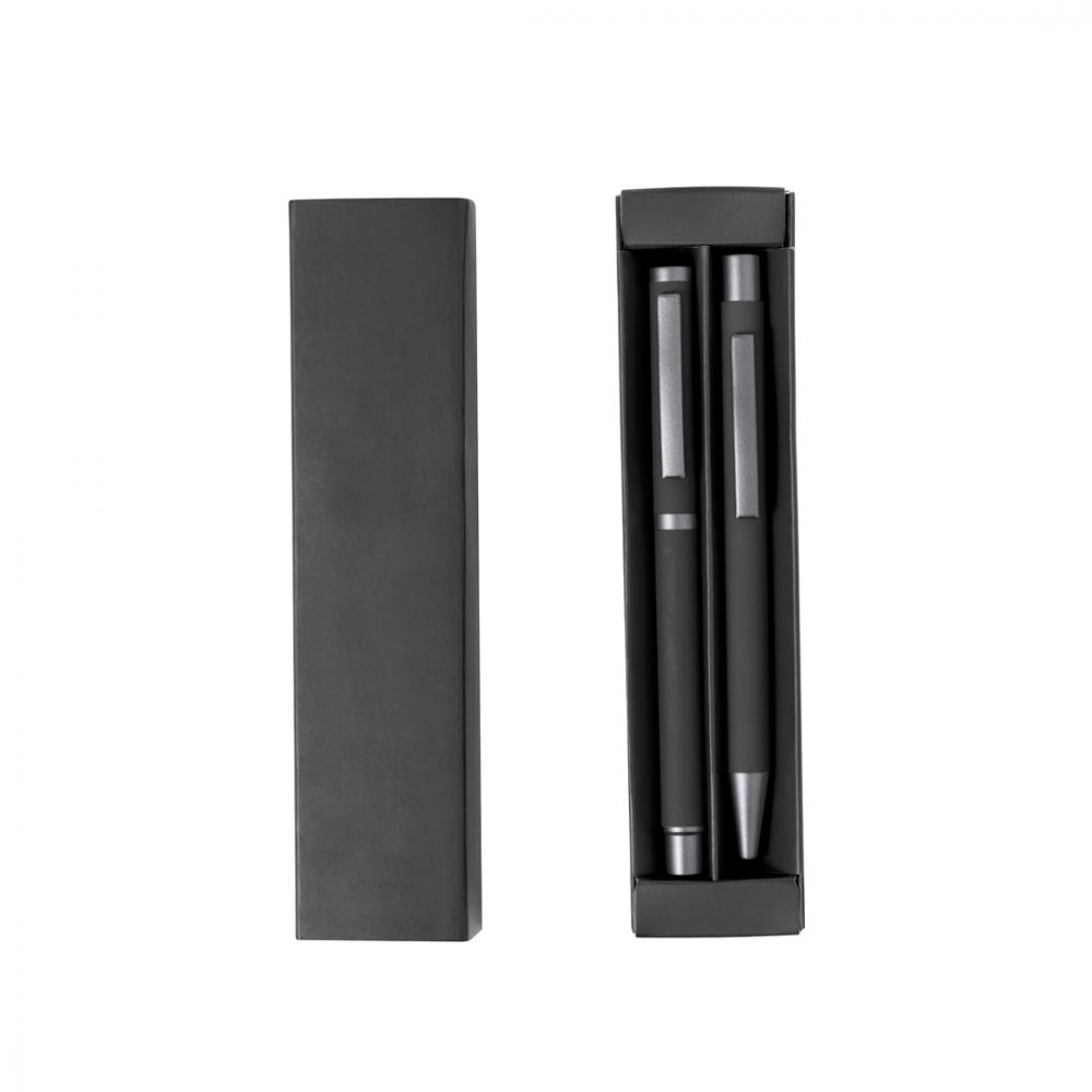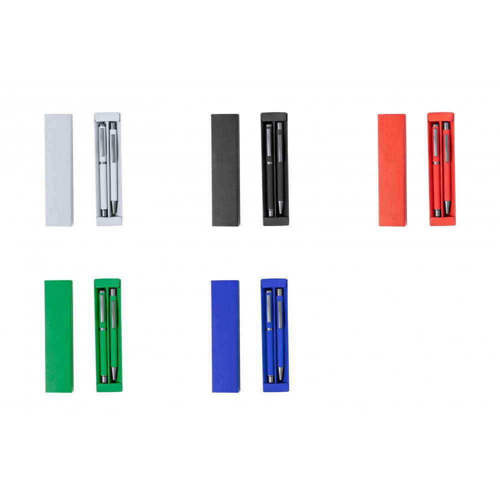 Характеристики Стильный набор шариковой ручки и ручки-роллера. Шариковая ручка с кнопкой и ручка-роллер с крышкой, обе с металлическим зажимом, крупным картриджем и синим чернилами. Корпус в различных сплошных цветах, с резиновым покрытием и темно-серыми металлическими акцентами. Представлены в чехле подходящего цвета, с вырезанным отделением для каждой детали. Ручка и ручка-роллер. Крупный картридж Алюминий
