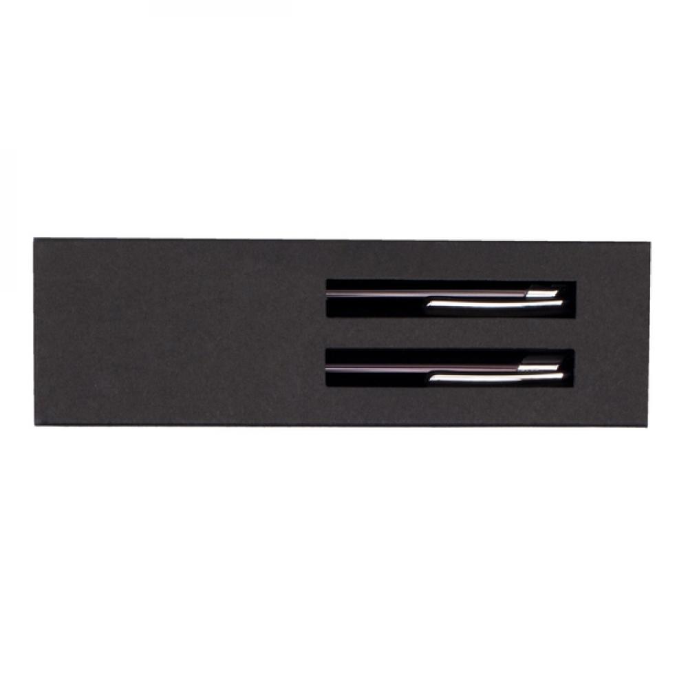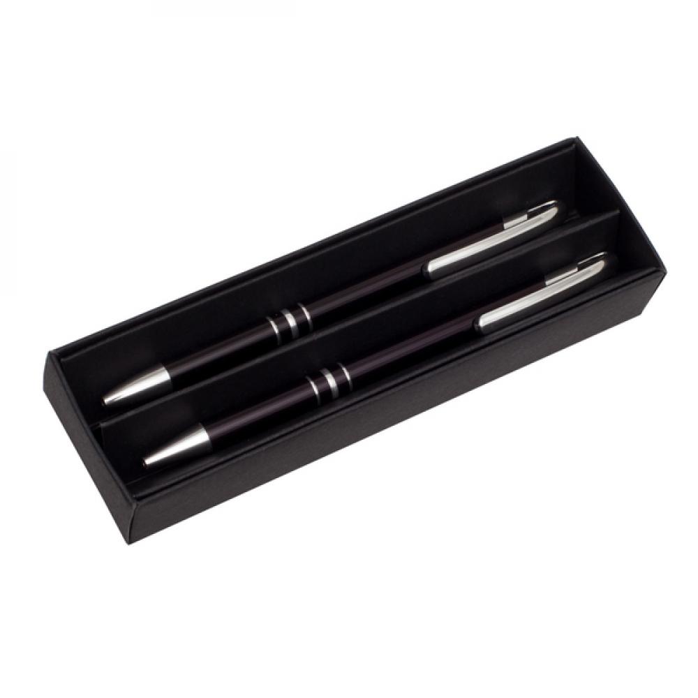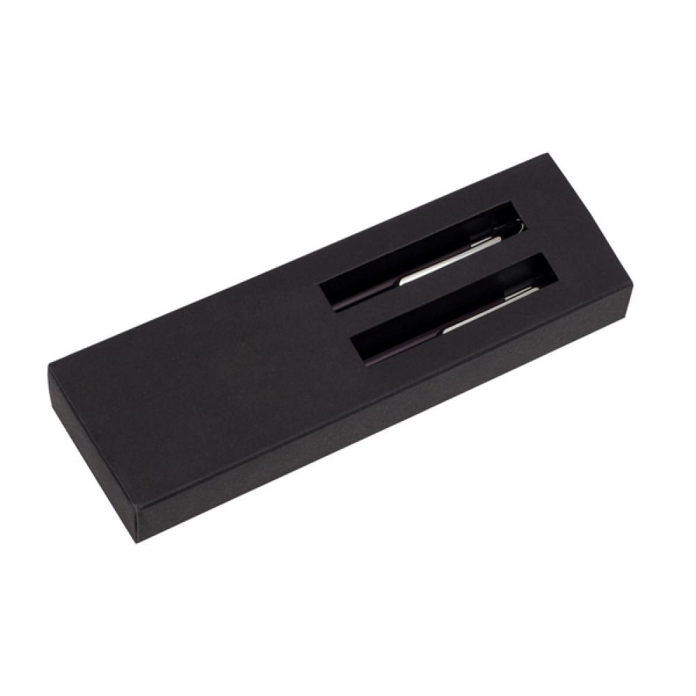 Набор из алюминиевой шариковой ручки и механического карандаша в бумажной надвижной коробке. Автоматический карандаш поставляется с грифелем 0,7 мм. Ручка со стержнем синего цвета. Упакован в подарочную коробку из черной бумаги.