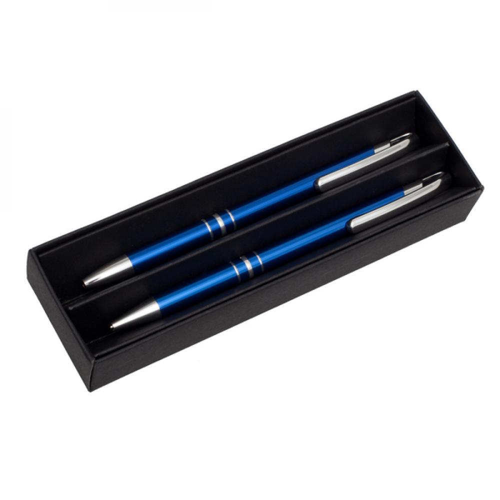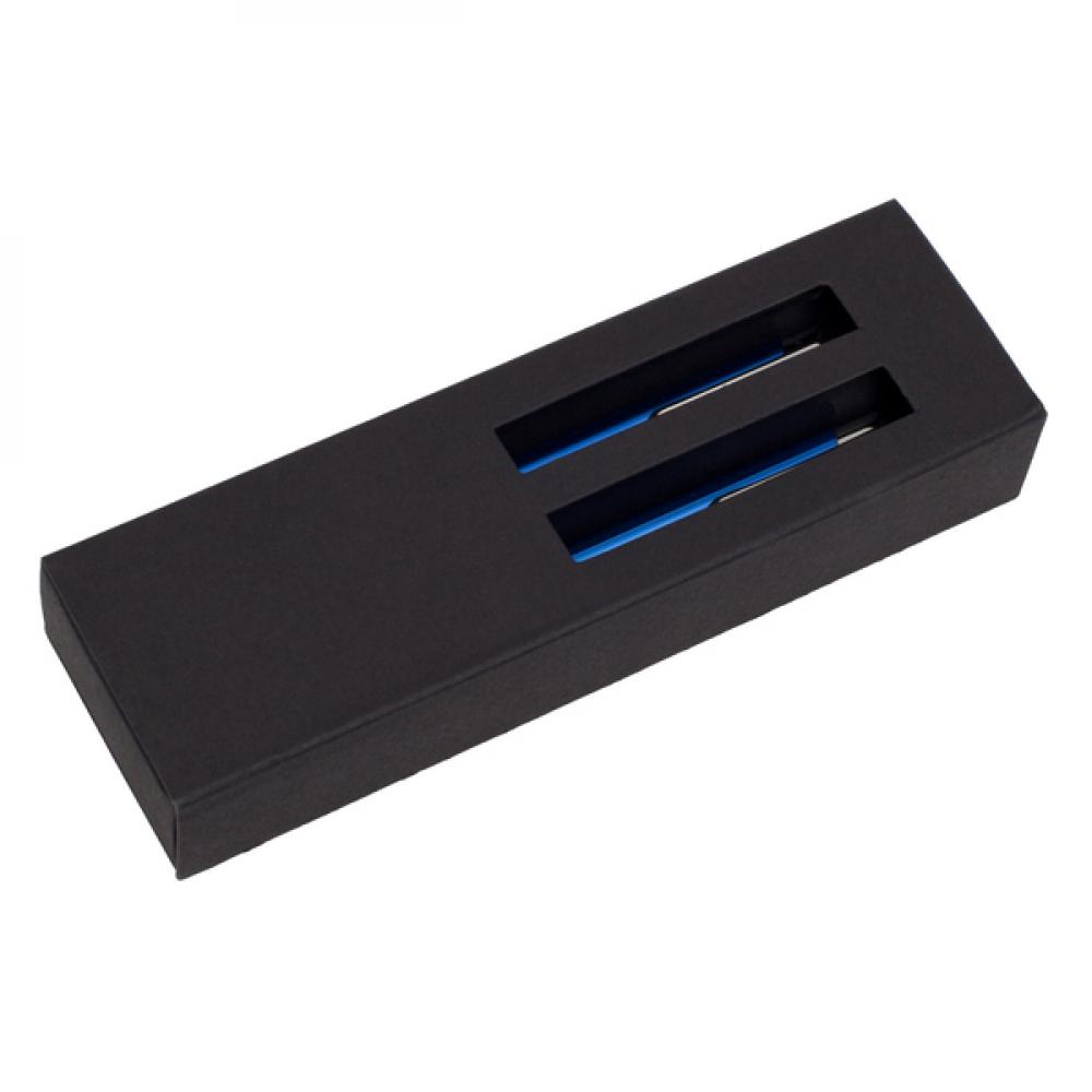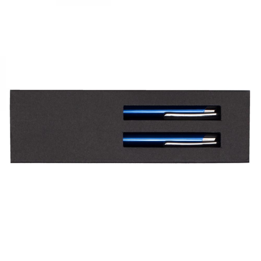 Набор из алюминиевой шариковой ручки и механического карандаша в бумажной надвижной коробке. Автоматический карандаш поставляется с грифелем 0,7 мм. Ручка со стержнем синего цвета. Упакован в подарочную коробку из черной бумаги.