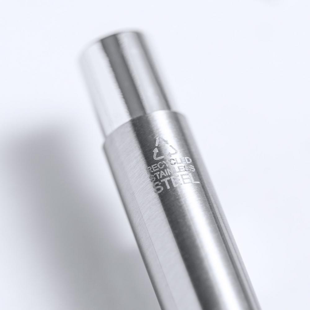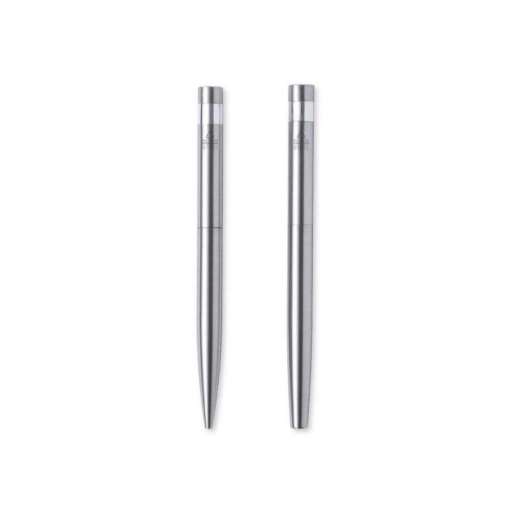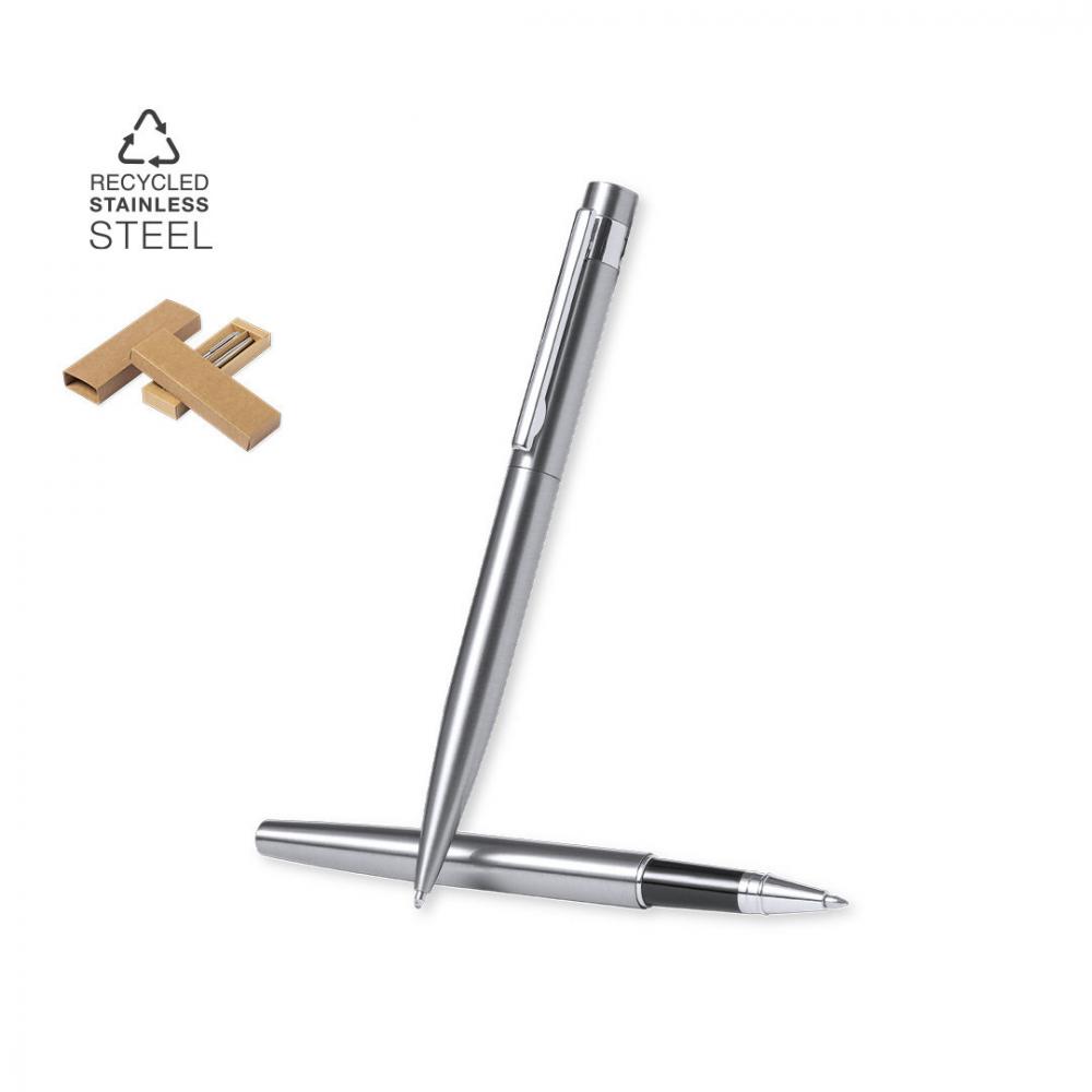 Экологически чистый набор шариковой ручки и роллера, изготовленный из переработанной нержавеющей стали. В том числе: шариковая ручка с кнопочным механизмом, корпус с серебристой отделкой и хромированная фурнитура. Металлический зажим и отличительная особенность ручки из переработанной нержавеющей стали на верхней части. Большой картридж и синие чернила.Ручка-роллер с кнопочным механизмом, с серебристым корпусом и хромированной фурнитурой. Металлический зажим и отличительный элемент из переработанной нержавеющей стали на капоте. Большой картридж и синие чернила.Набор представлен в индивидуальном дизайнерском футляре из крафт-бумаги с соответствующим рукавом.Сталь является одним из самых востребованных материалов, и ее можно найти практически везде, от повседневных изделий до крупных конструкций. Обладая бесчисленными свойствами, включая долговечность и высокий уровень возможности повторного использования, он является весьма ценной альтернативой экологичным решениям. При правильном обращении можно получить новые ресурсы бесконечного использования. Ручка и валик. Гигантская заправка Переработанная нержавеющая сталь