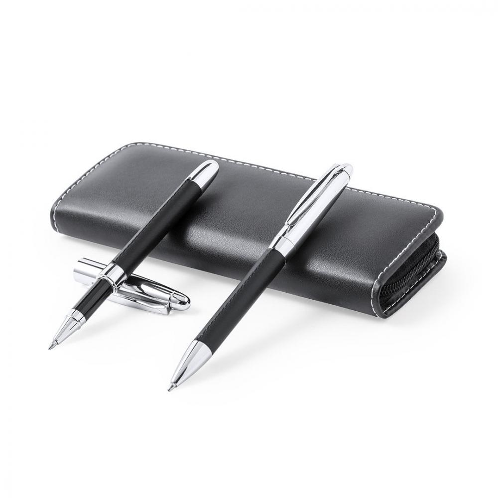 Особенности Набор шариковых ручек и роликов премиум-класса. Изготовлен из элегантного сочетания черного полиуретана и хромированного металла. Шариковая ручка с поворотным механизмом, синими чернилами и большим картриджем. Валик с колпачком и гелевыми чернилами синего цвета, большой картридж. Представлен в индивидуальном футляре из искусственной кожи с застежкой на молнию и соответствующими внутренними отделениями. Ручка и валик. Гигантская заправка Полиуретан/ Металл