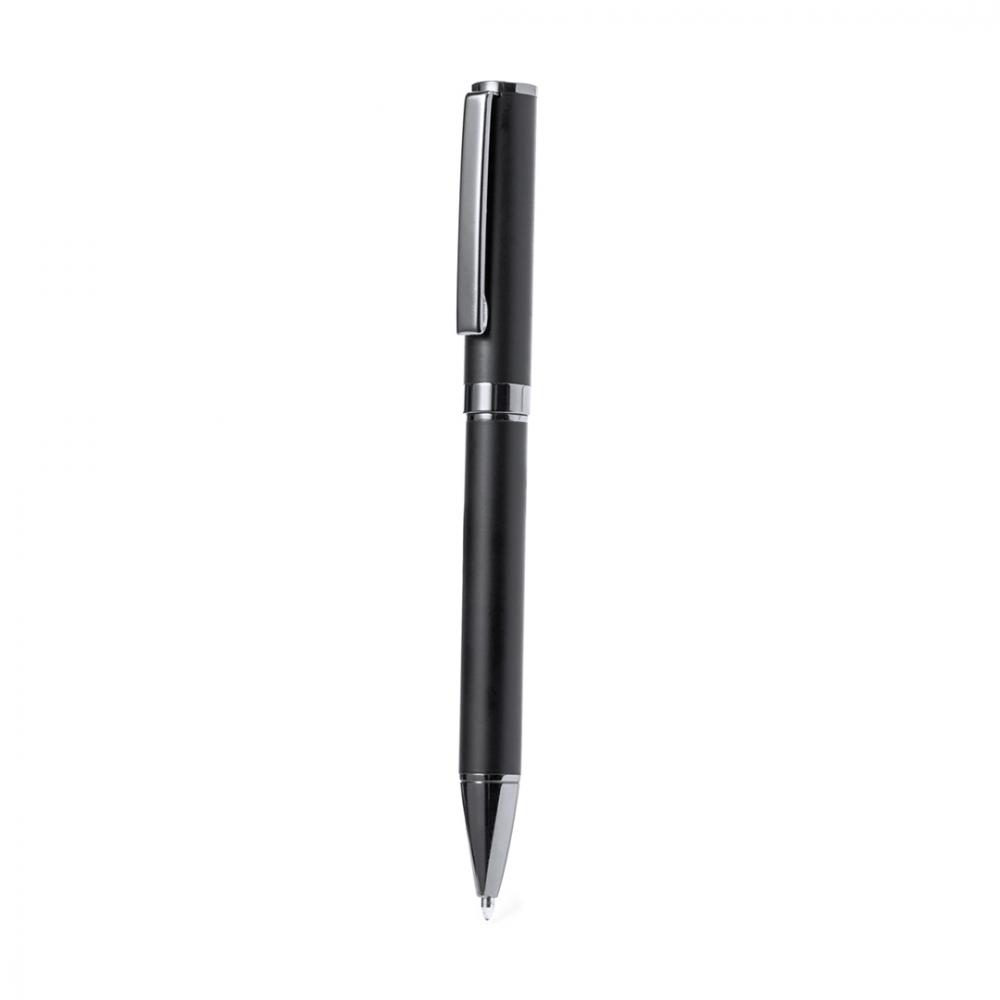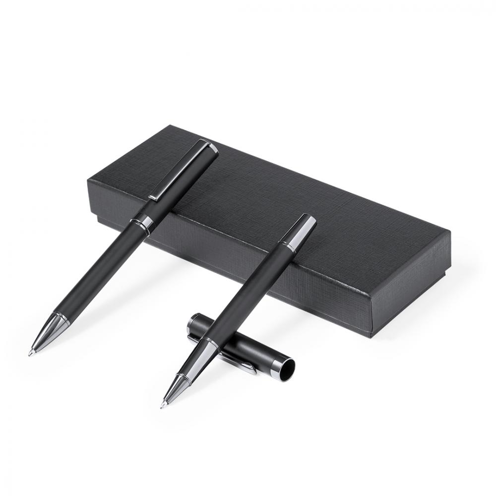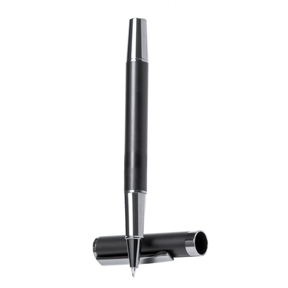 Характеристики Набор стильных шариковой и роллеровой ручек. Шариковая ручка с механизмом поворота и роллер с крышкой, обе с металлическим зажимом. Корпус в элегантной матово-черной отделке с деликатными хромированными акцентами. Синий стержень и поставляется в черном крафтовом футляре с бархатистым вырезом внутри. Ручка и роллер. Большой запас чернил Металлические