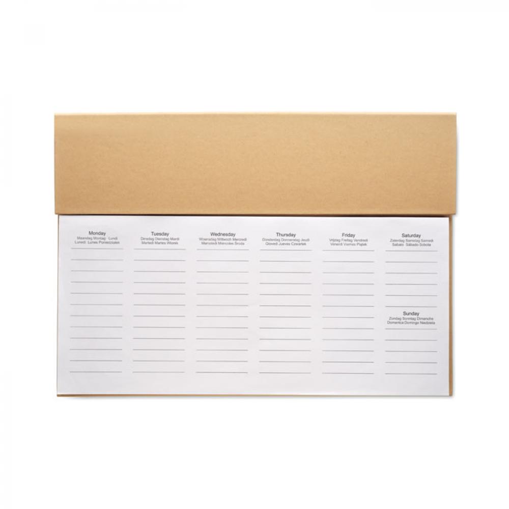 Настольный еженедельник-планер на 125 страниц на 6 языках (EN/DE/FR/ES/IT/NL/PL) с обложкой из крафт-бумаги, картонной ручкой с синими чернилами, деревянной линейкой и блокнотом со стикерами.