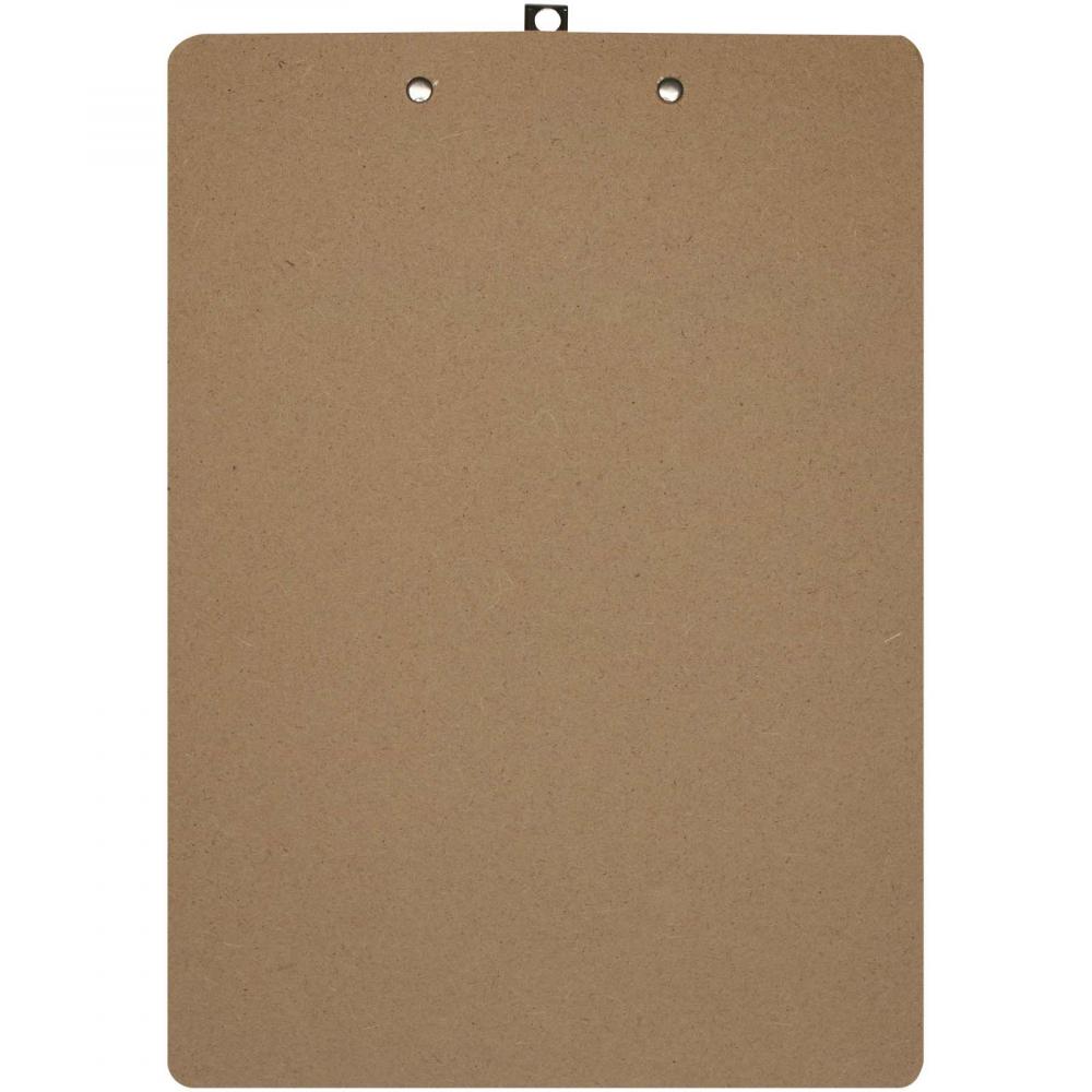 Удобный планшет для бумаги из МДФ (древесноволокнистая плита средней плотности). Зажим для удержания бумаги изготовлен из железа и пластика PP. Размеры: 32 x 23 x 0,24 см.