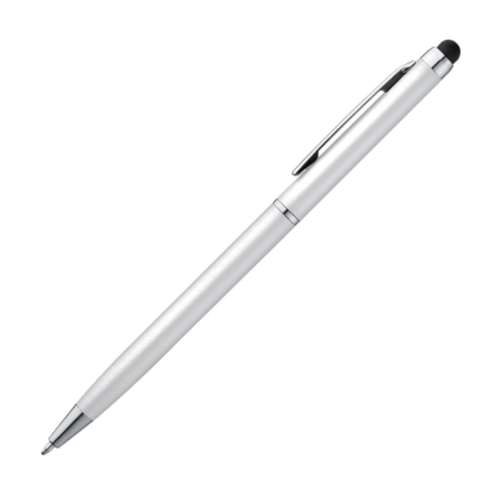 Элегантная тонкая пластиковая ручка с резинкой для сенсорных экранов. Синие чернила.