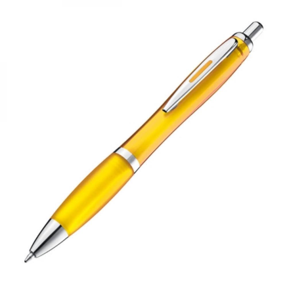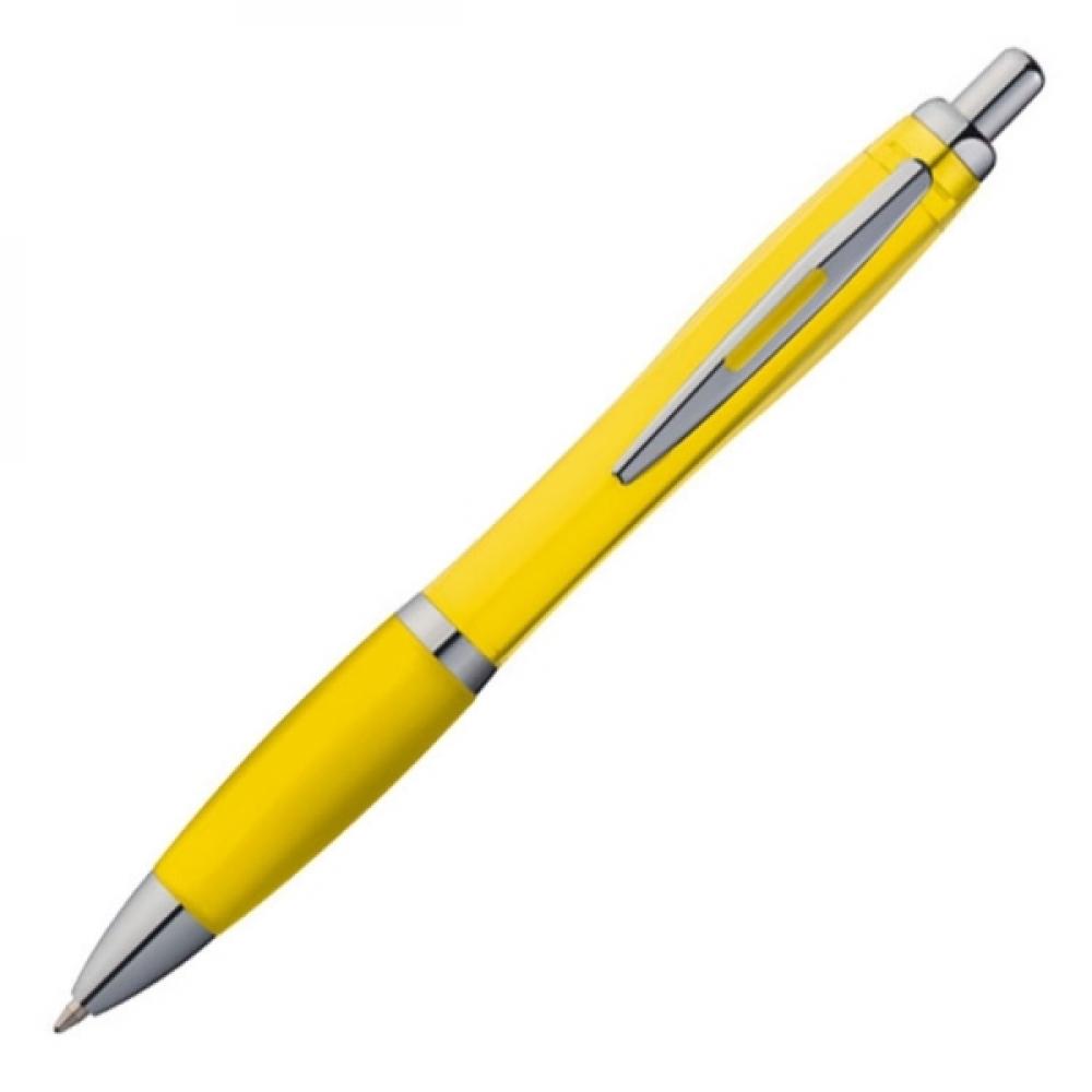 Пластиковая шариковая ручка с нескользящей прорезиненной накладкой и блестящими деталями. Оснащена системой нажатия и синим стержнем. Доступна в широком ассортименте цветов.