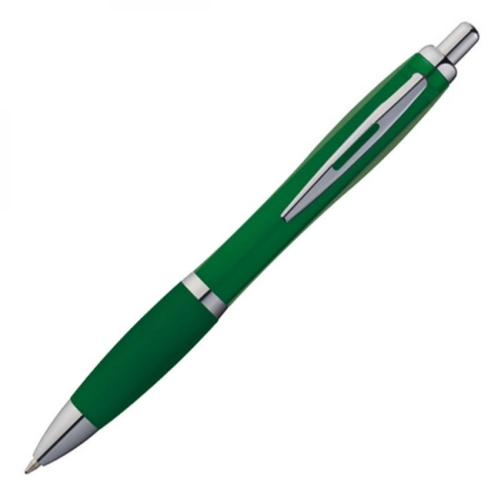 Пластиковая шариковая ручка с нескользящей прорезиненной накладкой и блестящими деталями. Оснащена системой нажатия и синим стержнем. Доступна в широком ассортименте цветов.