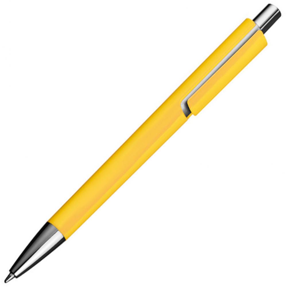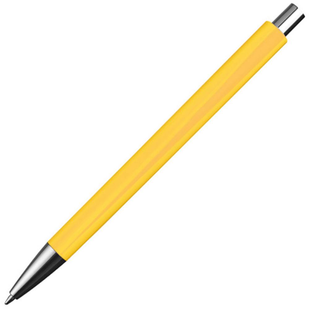 Пластиковая ручка с синим стержнем и серебристым элементом под клипом.