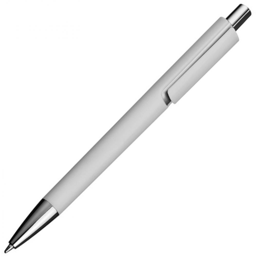 Пластиковая ручка с синим стержнем и серебристым элементом под клипом.