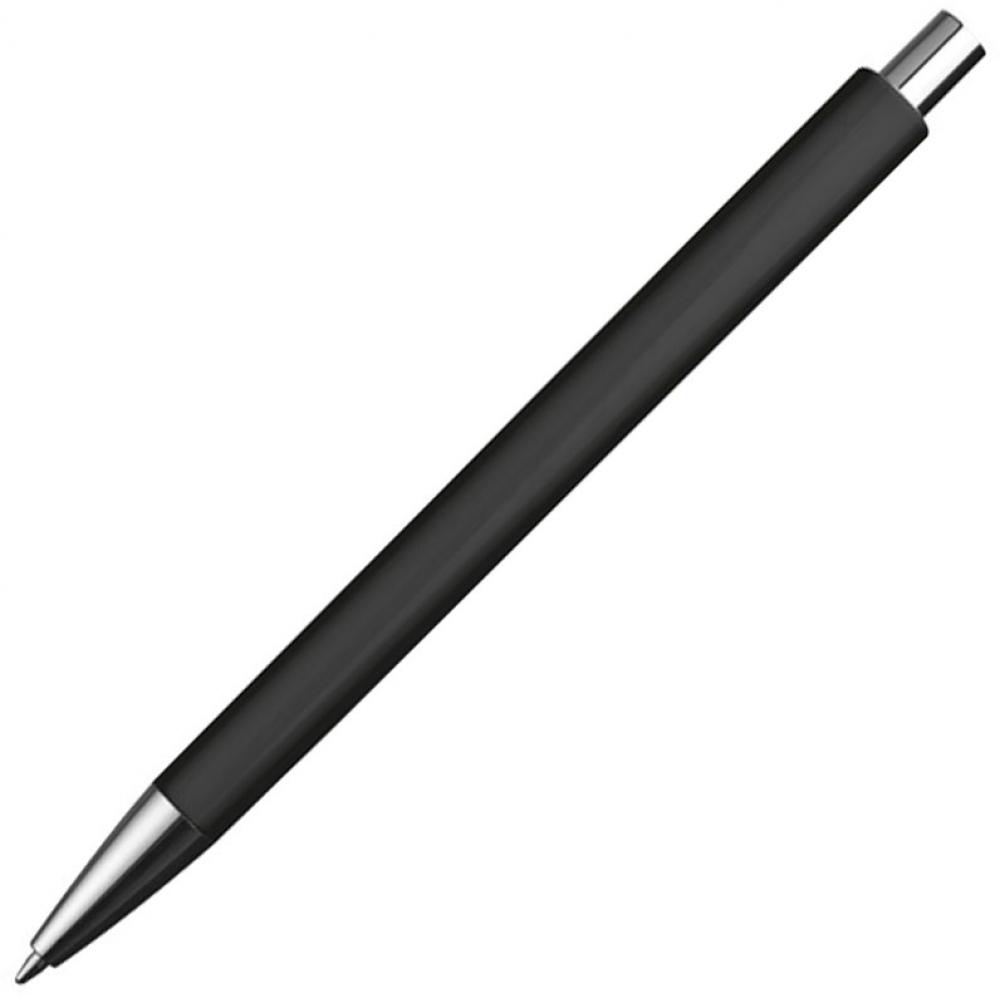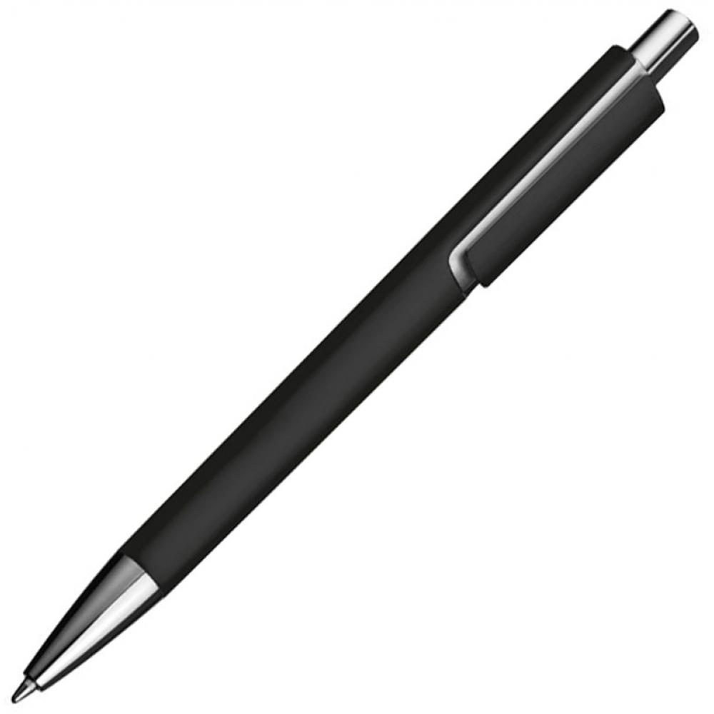 Пластиковая ручка с синим стержнем и серебристым элементом под клипом.