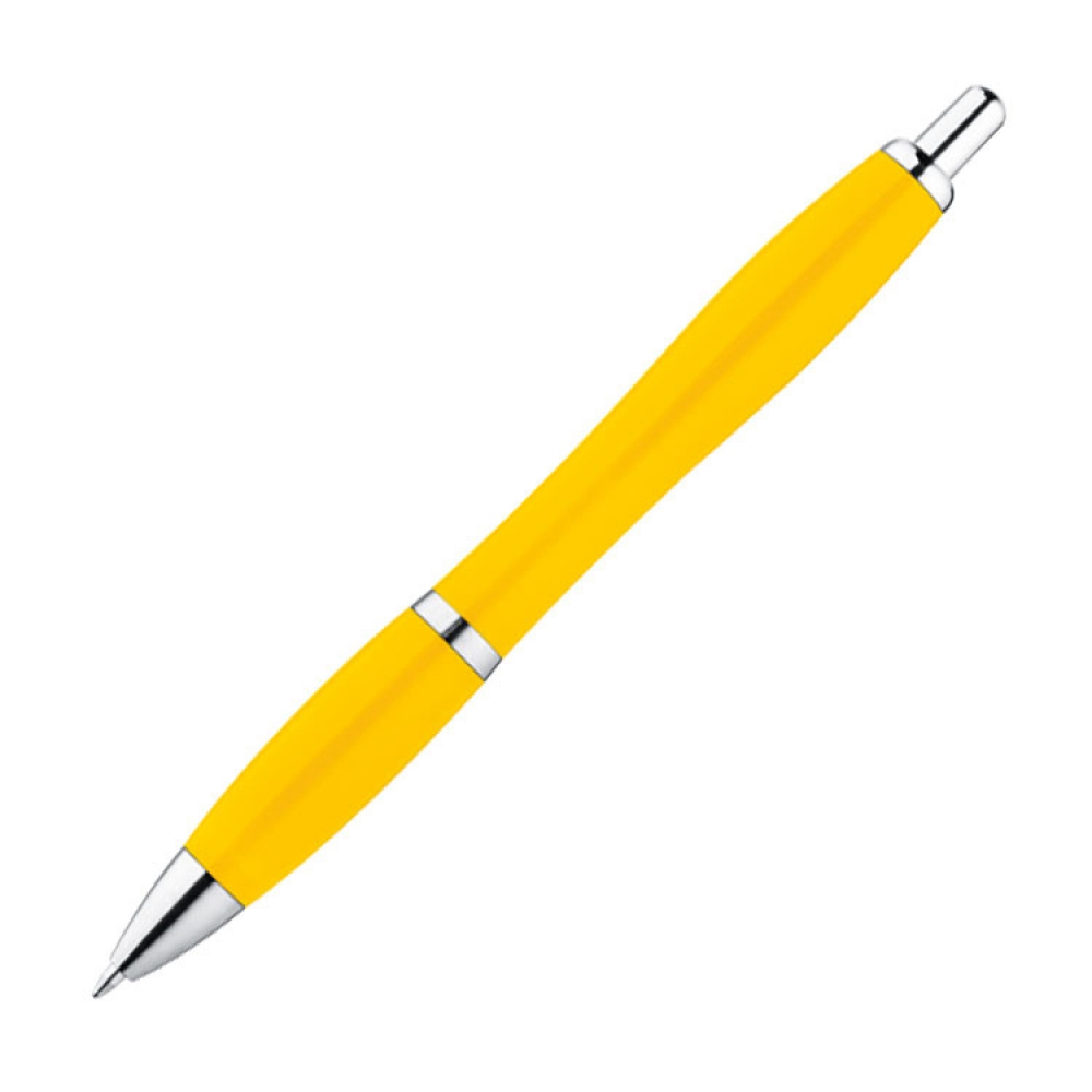 Классическая пластиковая ручка с металлическим клипом и синим стержнём. Выполнена из непрозрачного материала, доступная в нескольких, привлекательных цветах.