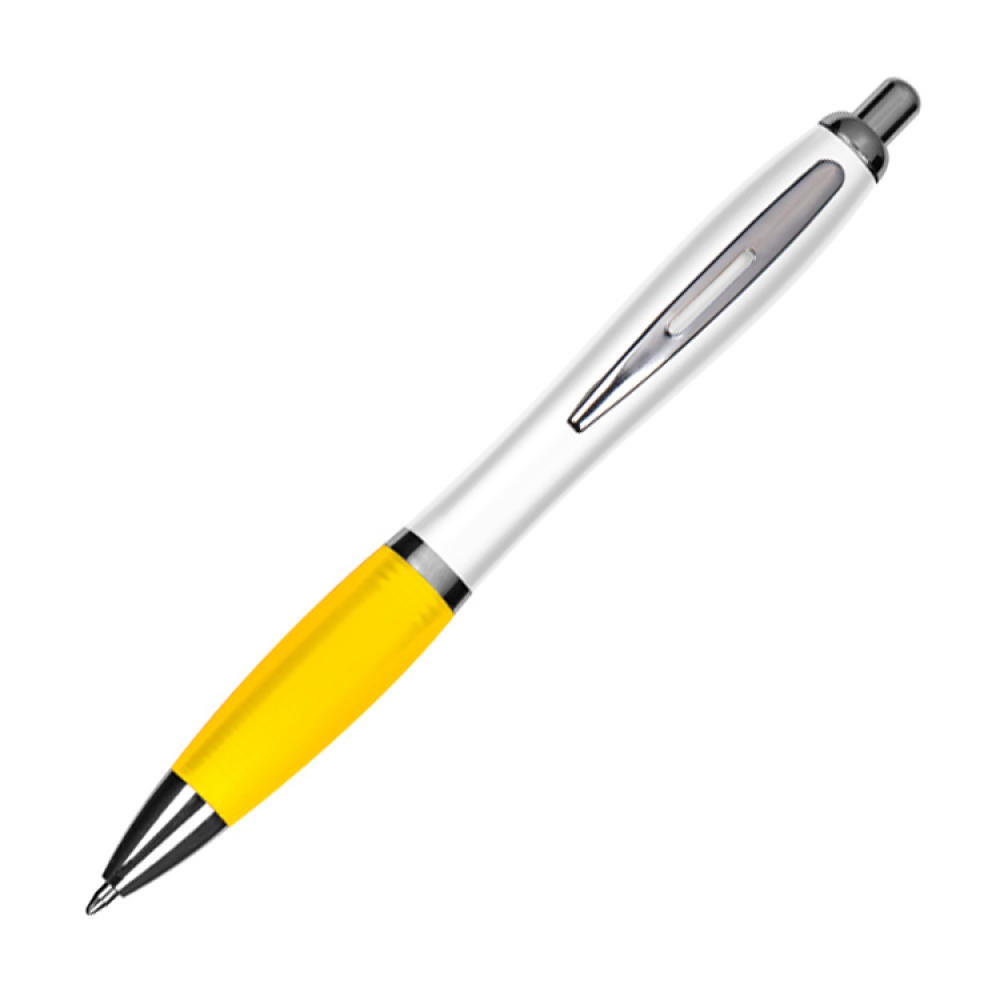 Пластиковая ручка с белым корпусом и цветной резинкой. Имеет металлический клип и большой синий стержень. Логотип можно разместить под клипом.