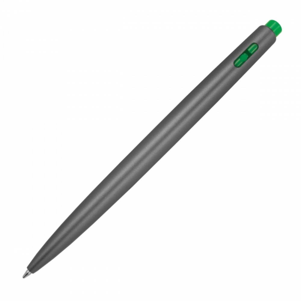 Выдвижная ручка из переработанного пластика с цветными вставками и большим стержнем, пишущим синим цветом.