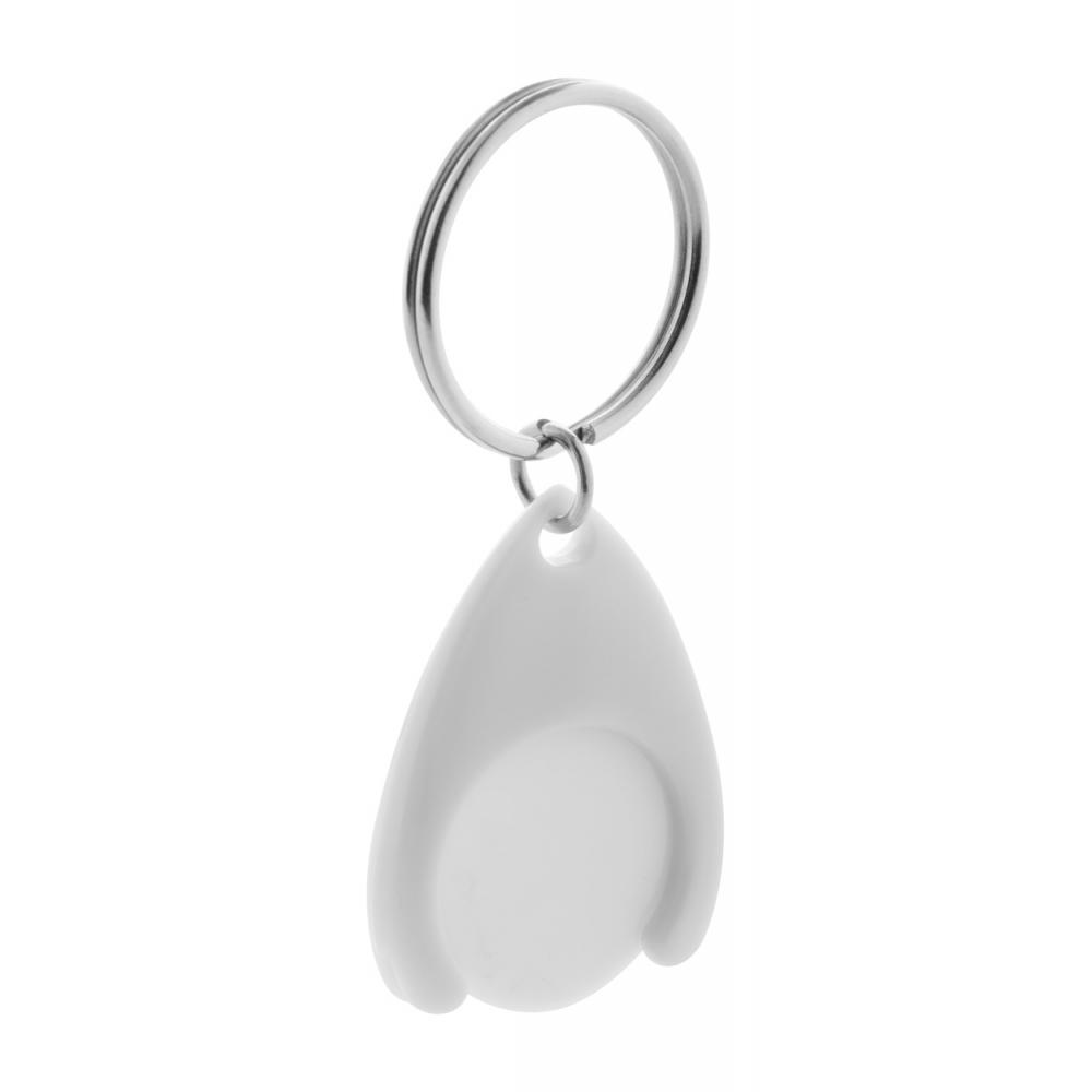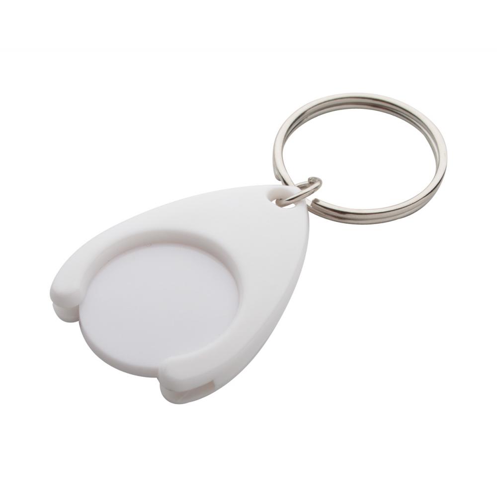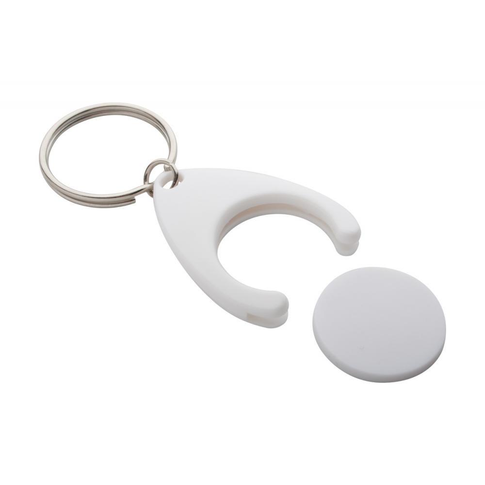 Пластиковый брелок с монетами на тележке для покупок и металлическим кольцом. Размер монеты: ø24 × 2 мм.