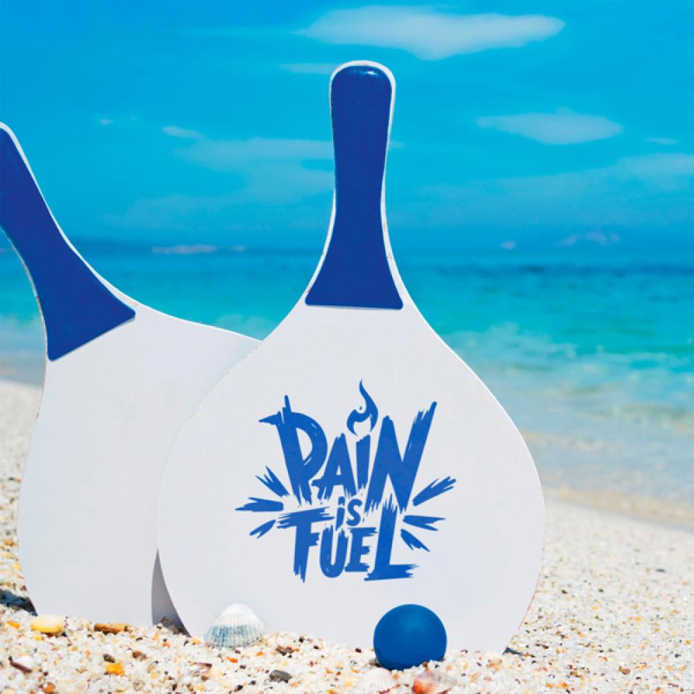 Набор из двух ракеток для пляжного тенниса с мячом. Корпус ракетки белый, ручка в том же цвете, что и мяч.