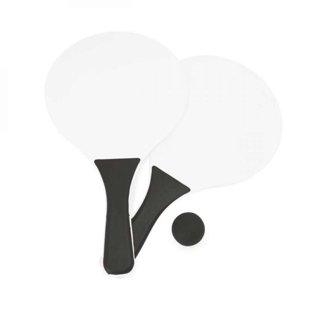 Набор из двух ракеток для пляжного тенниса с мячом. Корпус ракетки белый, ручка в том же цвете, что и мяч.