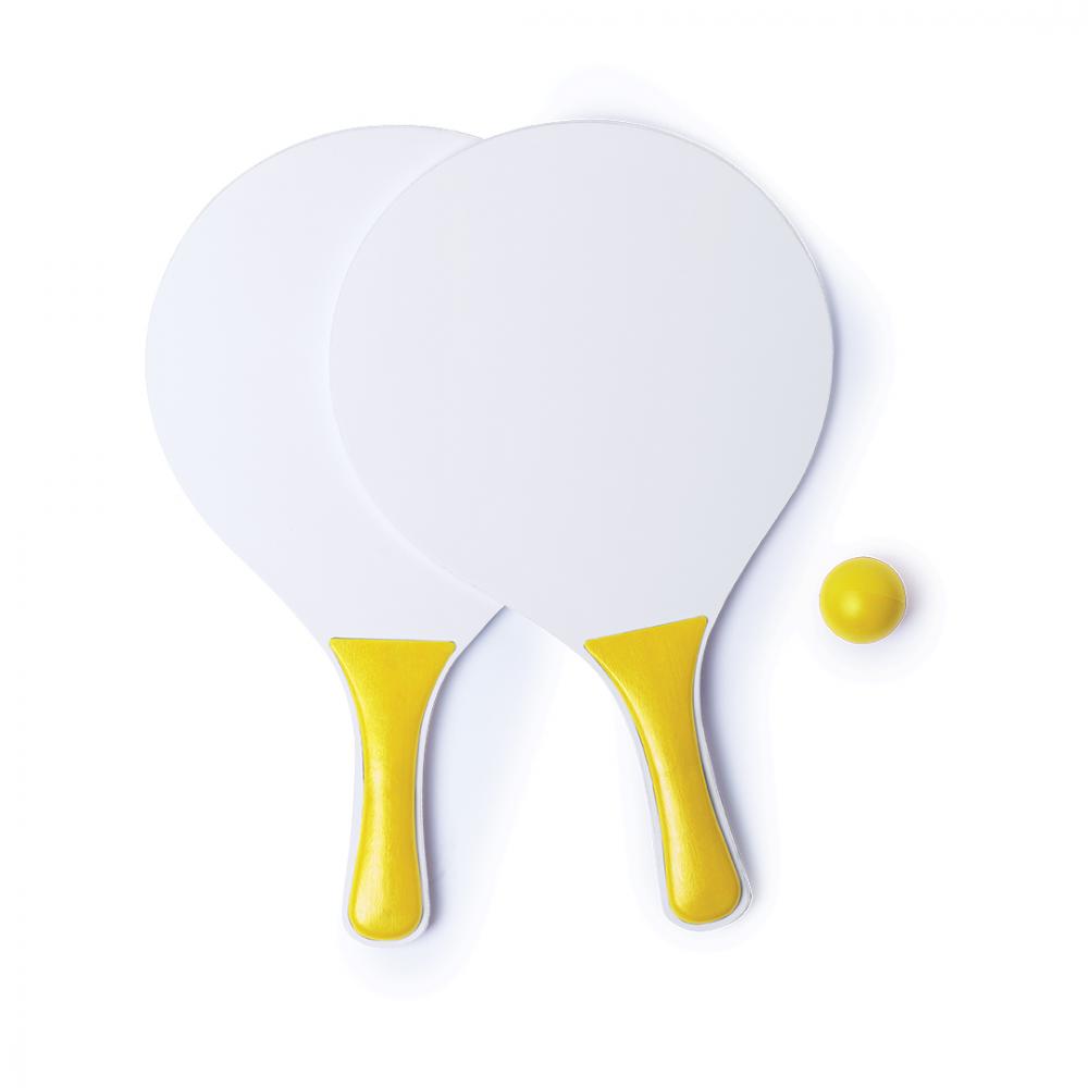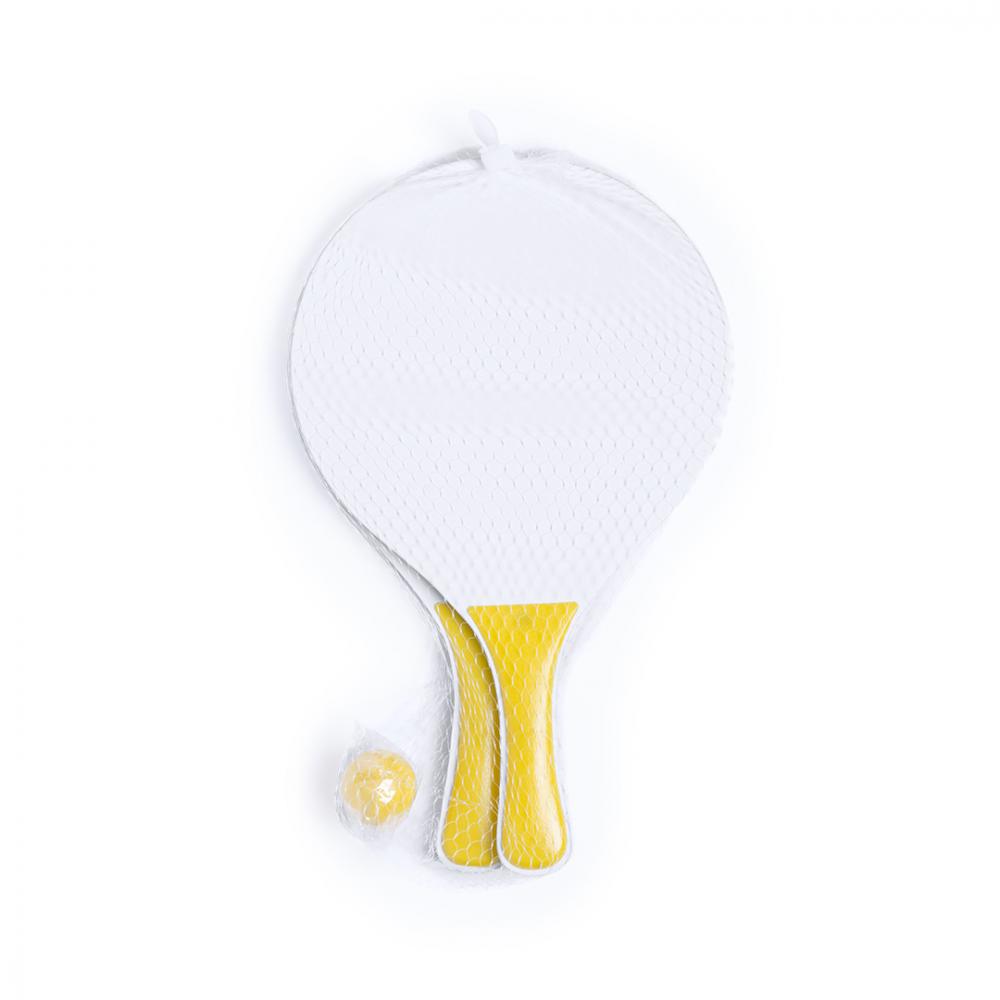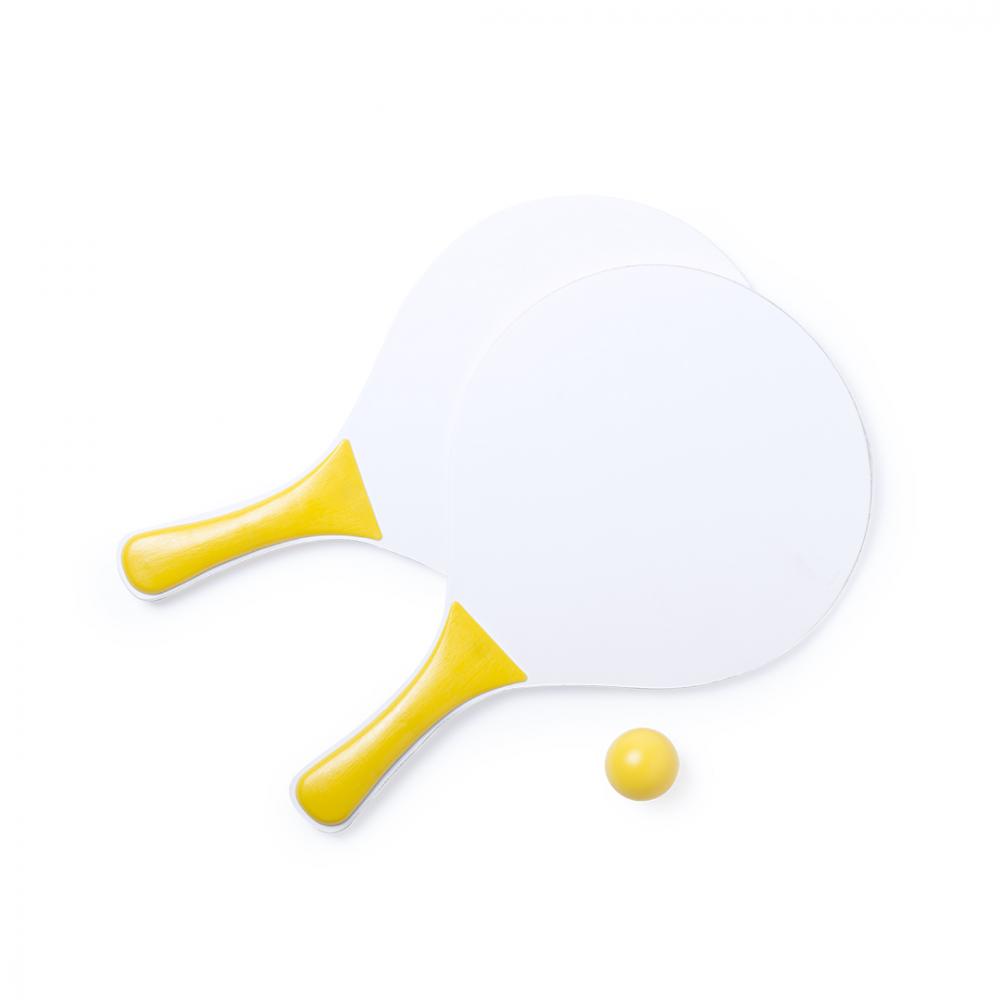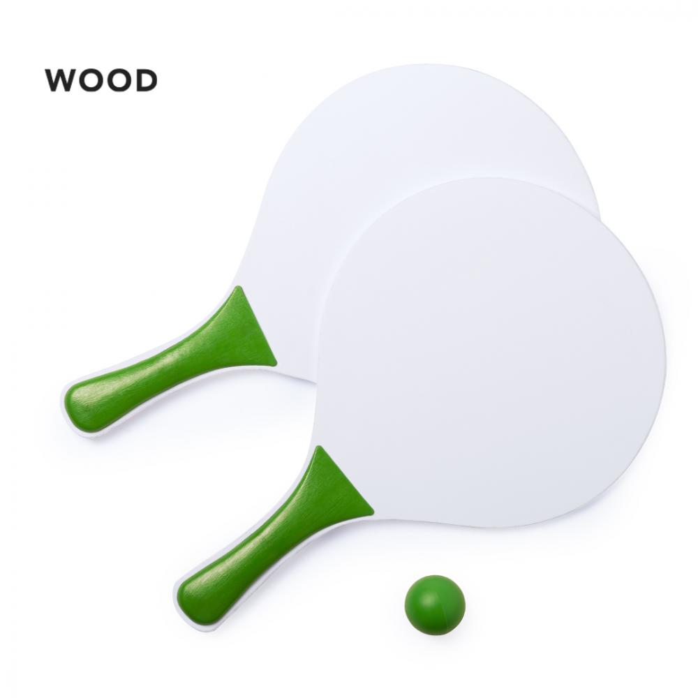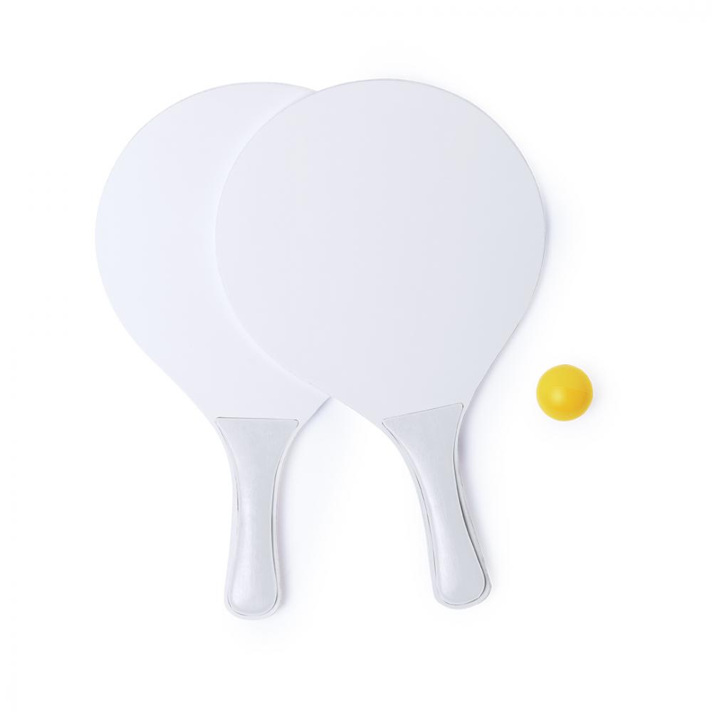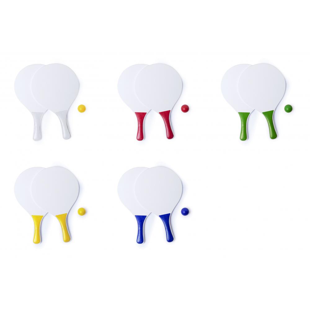 Особенности Пара пляжных ракеток белого цвета, натуральное дерево. С усиленной ручкой в различных ярких тонах. Представлен в сетчатом мешке с шариком соответствующего цвета.