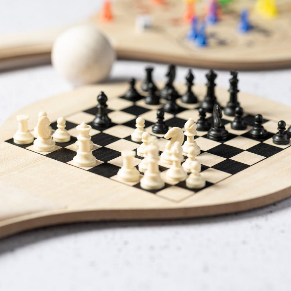 Особенности Пара пляжных ракеток со встроенными досками для шахмат, шашек и парчези. Изготовлен из дерева, с ручкой, покрытой пшеничной соломой, и шариком, также покрытым пшеничной соломой. Включая шахматные фигуры, шашки, фигуры парчези и игральные кости. Комплект представлен в индивидуальном рюкзаке из 100% хлопка с завязками в тон.Пшеничная солома способствует использованию натурального сырья, сокращая выбросы загрязняющих веществ. 3 Игры. Хлопковый мешочек