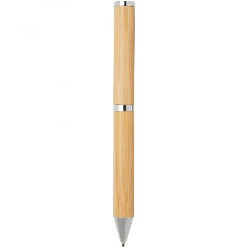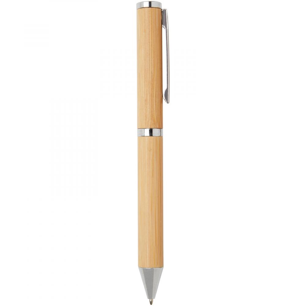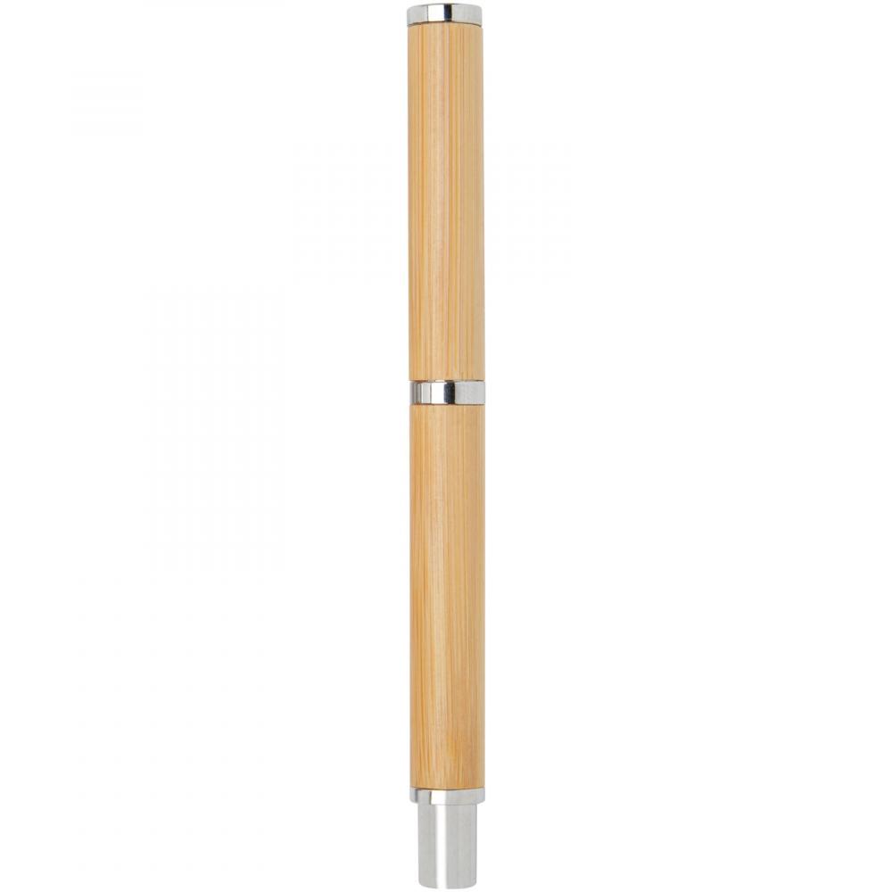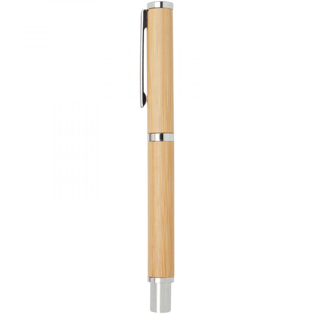 Подарочный набор шариковой и роллерной ручек с корпусами из бамбука. Бамбук является возобновляемым ресурсом и более устойчивым выбором для производства ручек. Другие компоненты в этом наборе ручек изготовлены из блестящей хромированной переработанной латуни. Переработка латуни помогает сократить потребность в добыче и переработке новых сырьевых материалов, что сохраняет природные ресурсы. Выбирая набор ручек с бамбуковым корпусом и переработанной латунью, вы поддерживаете более устойчивые методы получения сырья и переработки. Это позволяет вам наслаждаться письменными инструментами, которые одновременно стильные и экологически осознанные. Поставляется в коробке из крафт-бумаги с желтой шелковой лентой. Цвет чернил ручек: черный. Размер коробки: 16,8 x 7 x 2,7 см.