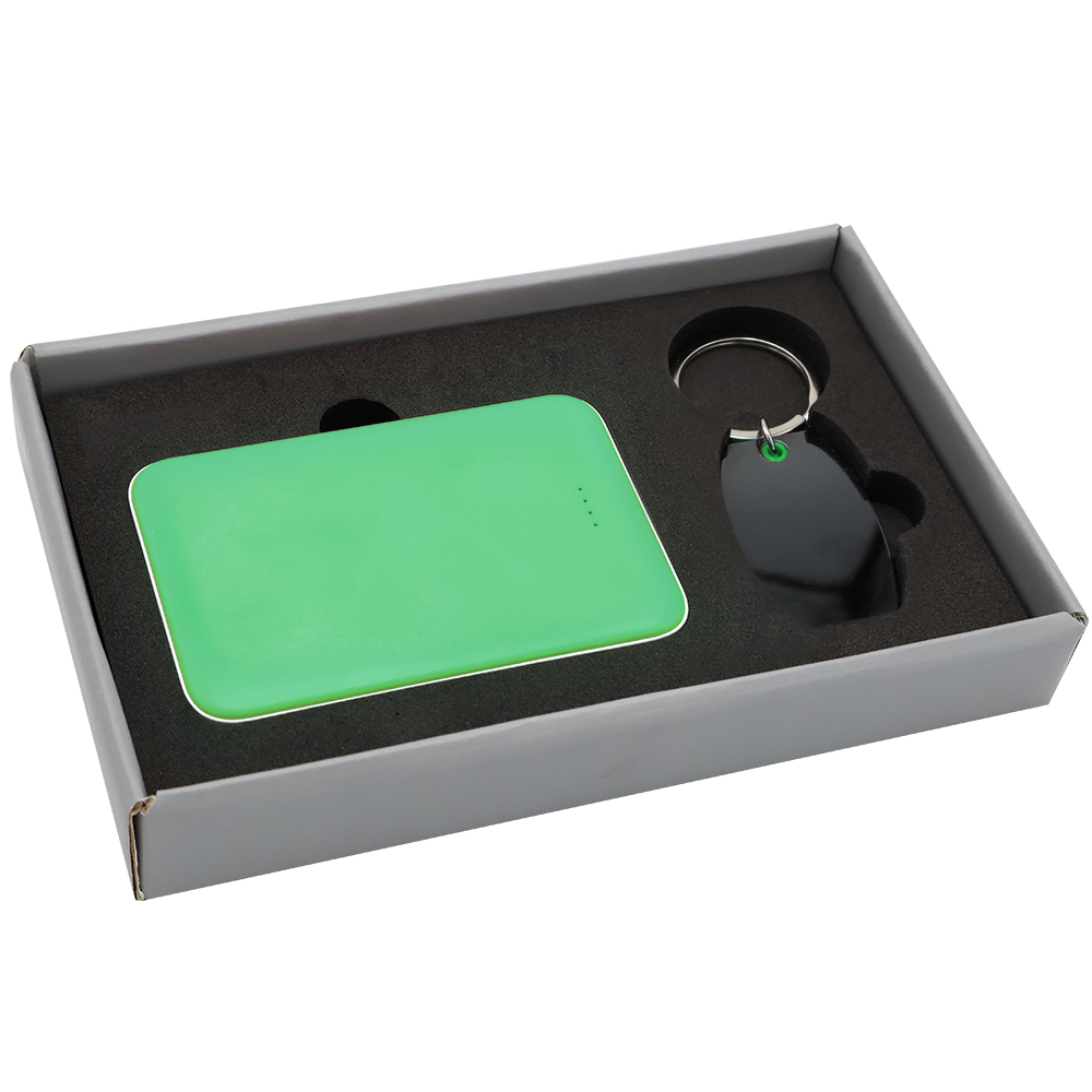 Подарочный набор в элегантной цветной картонной коробке серого цвета с конструкцией крышка-дно. Внутри расположены аккуратно закрепленные на ложементе внешний аккумулятор емкостью 5000 mAh и металлический карманный брелок. Внешний аккумулятор обладает компактным дизайном и обеспечивает надежный запас энергии для мобильных устройств в пути, а стильный металлический брелок станет практичным и эстетичным аксессуаром для ключей. Этот набор идеально подходит в качестве презента для тех, кто ценит удобство, качество и современный стиль.