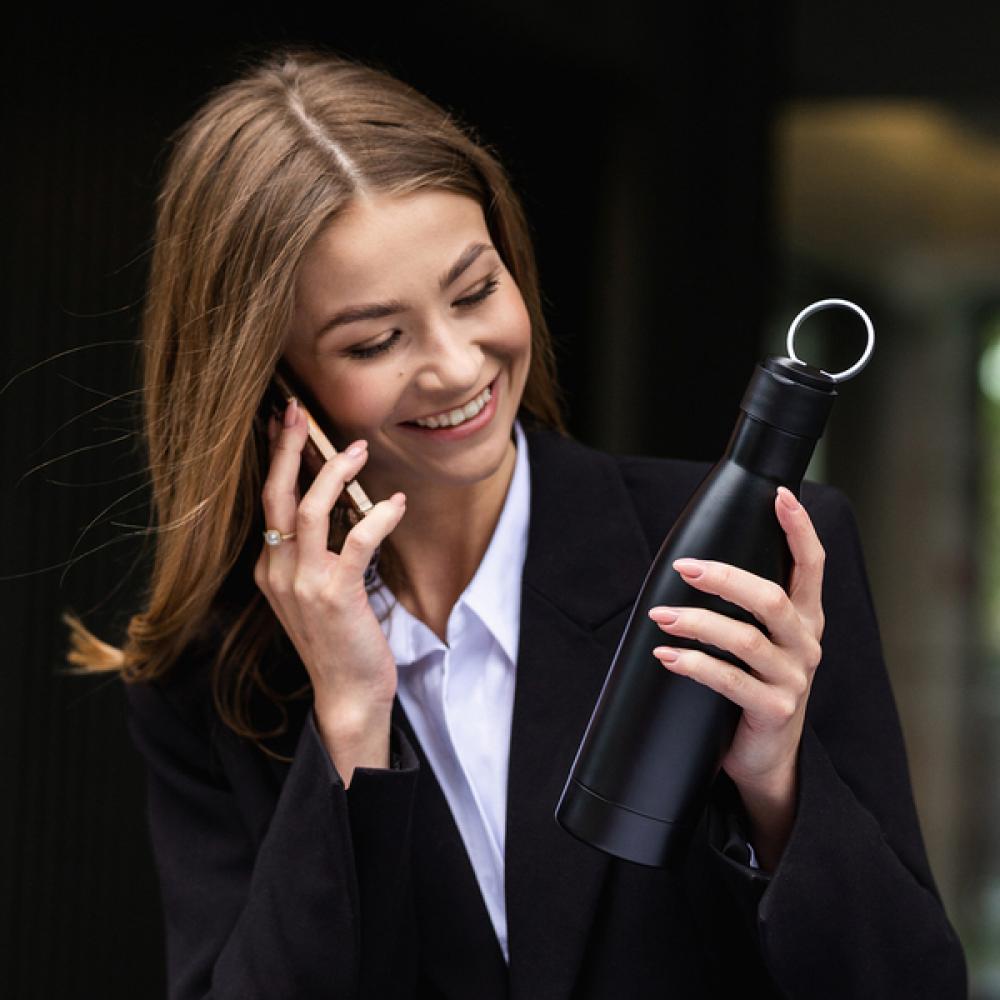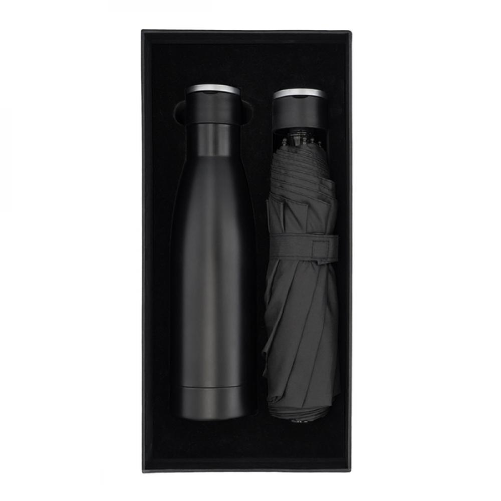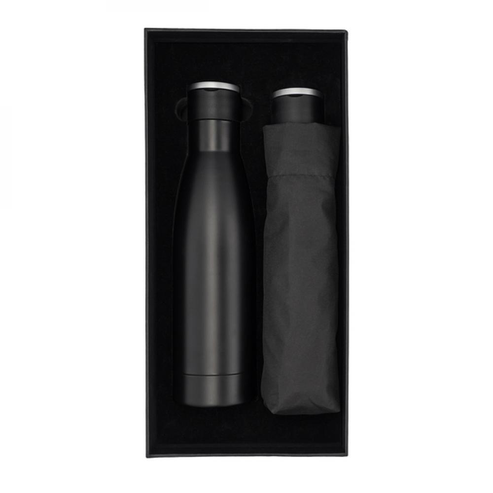 Набор корпоративных подарков, состоящий из вакуумной бутылки и зонта. Все упаковано в элегантную черную коробку. Вакуумная бутылка из нержавеющей стали с двойной стенкой и складной ручкой. Объем 500 мл. Зонт из материала RPET 190T понж, ребра из стекловолокна. Упакован в водонепроницаемый чехол.