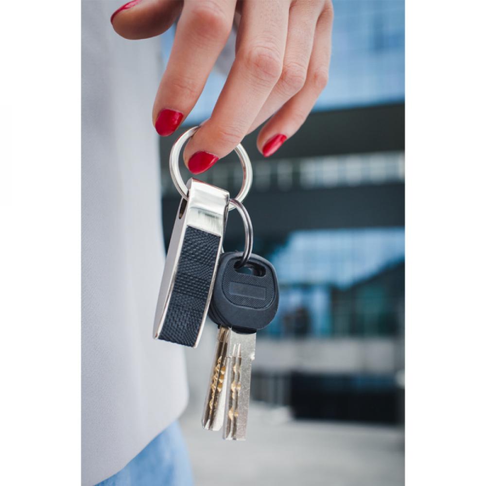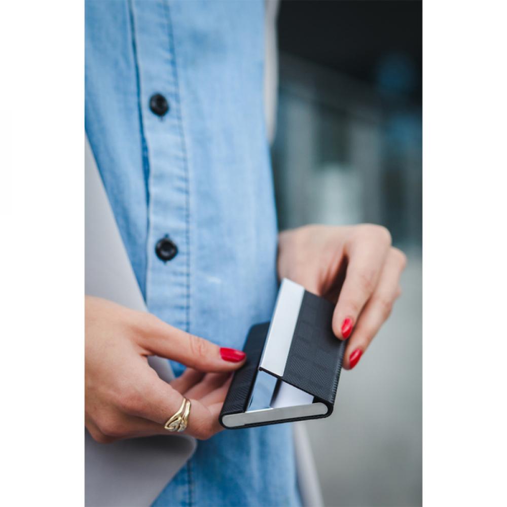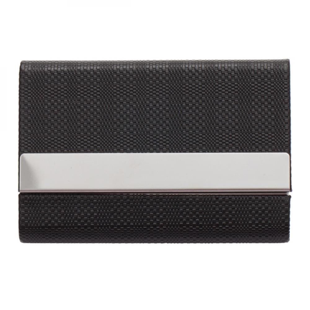 Подарочный набор из металла и полиуретана, в который входит отделение для визиток на 15 карточек, брелок и шариковая ручка с синим стержнем. Упакован в подарочную коробку.
