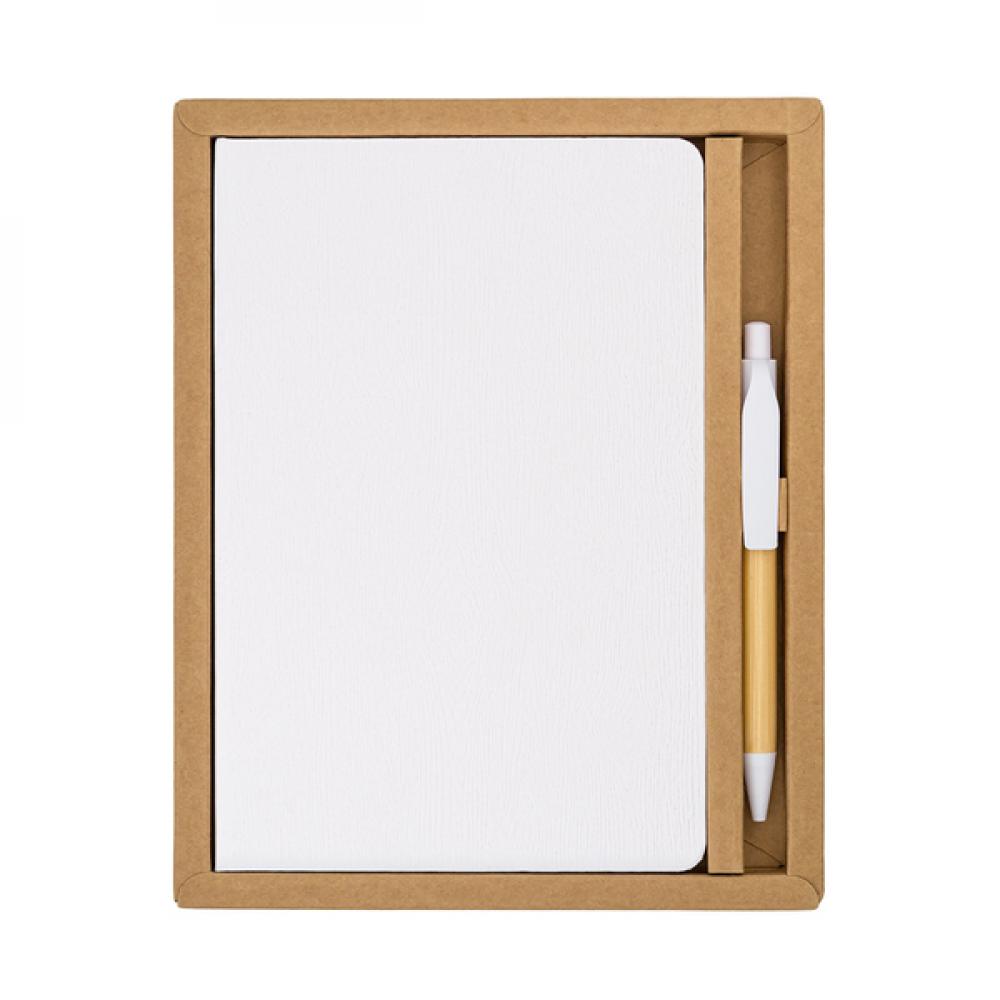 Набор состоит из линейной тетради формата А5 и ручки. Твердая обложка тетради имеет лямку для отметки последней использованной страницы и резинку для закрытия в нерабочем состоянии. 80 листов, кремового цвета (бумага 70 г/м2). Ручка из бамбука с синим стержнем. Набор упакован в коричневую коробку.
