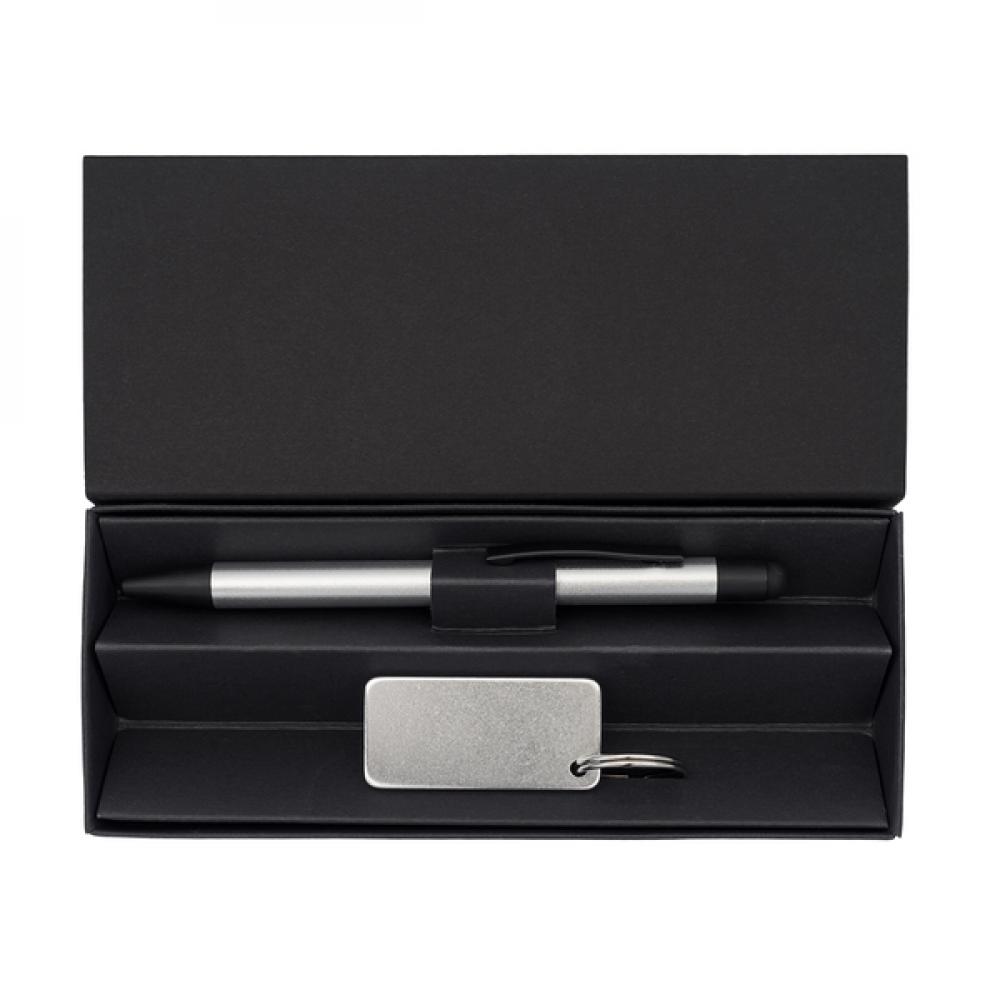 Рекламный набор, состоящий из шариковой ручки и брелока из переработанного алюминия, упакованных в черную картонную коробку. Ручка с синим стержнем.