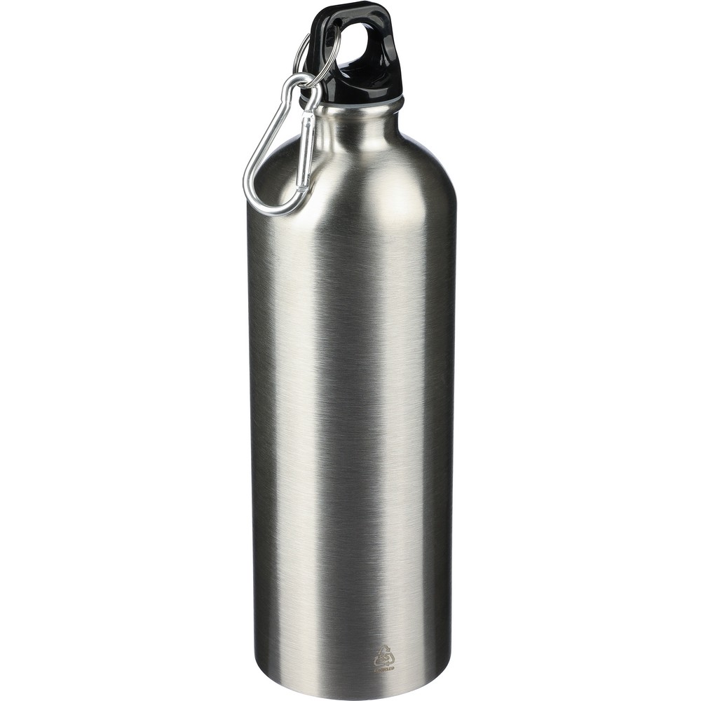Спортивная бутылка объемом 750 мл, с иконкой переработки на изделии, не подходит для мытья в посудомоечной машине, изготовлена из переработанной нержавеющей стали однослойной, с крышкой из ПП, серебристым алюминиевым карабином.
