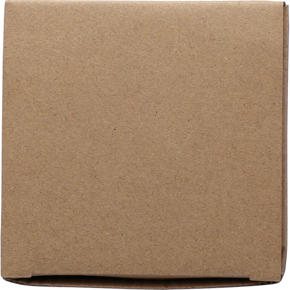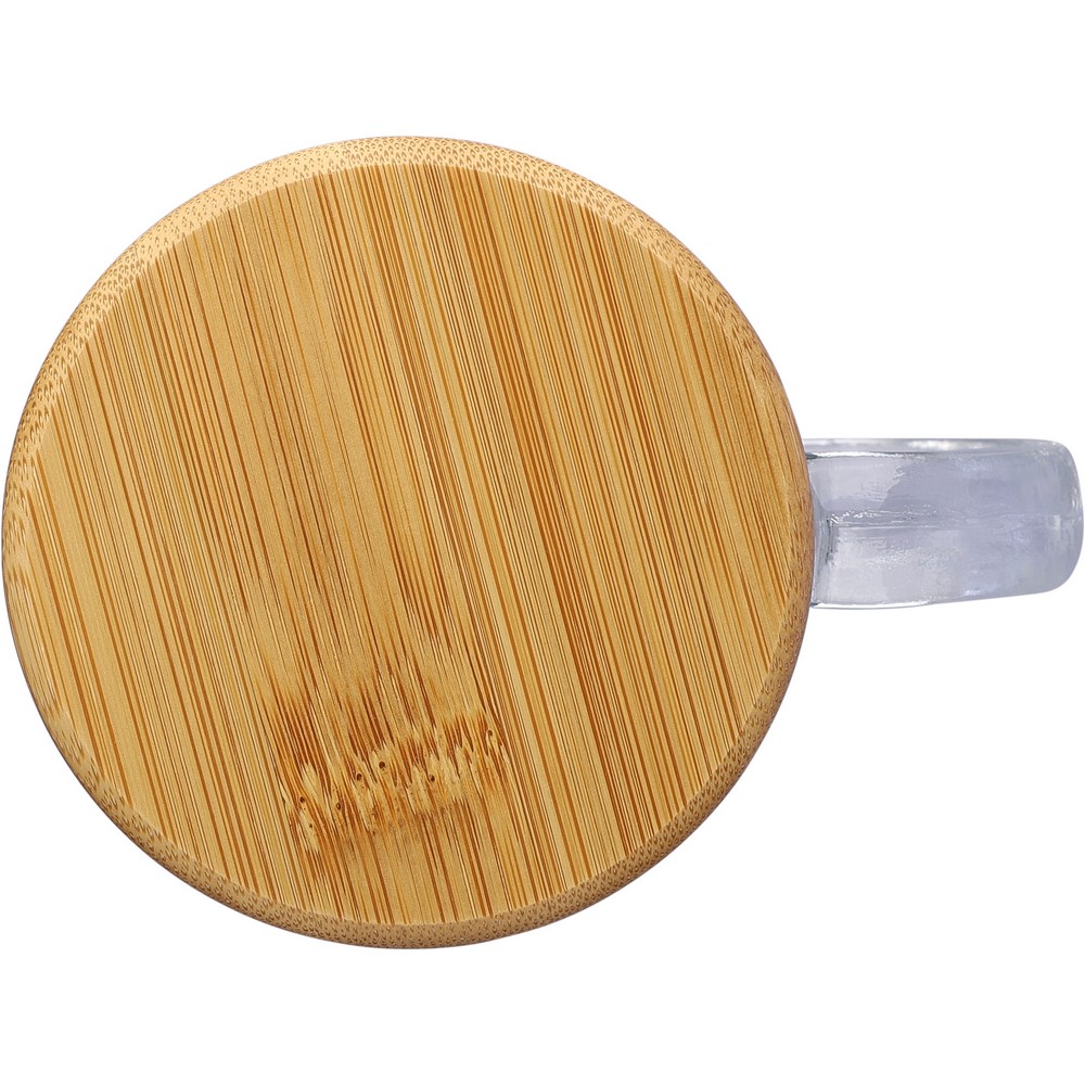 Стеклянный кружка объемом 300 мл с бамбуковой крышкой, которая может использоваться в качестве подставки, упакована в коричневую картонную коробку, изделие из переработанного стекла.