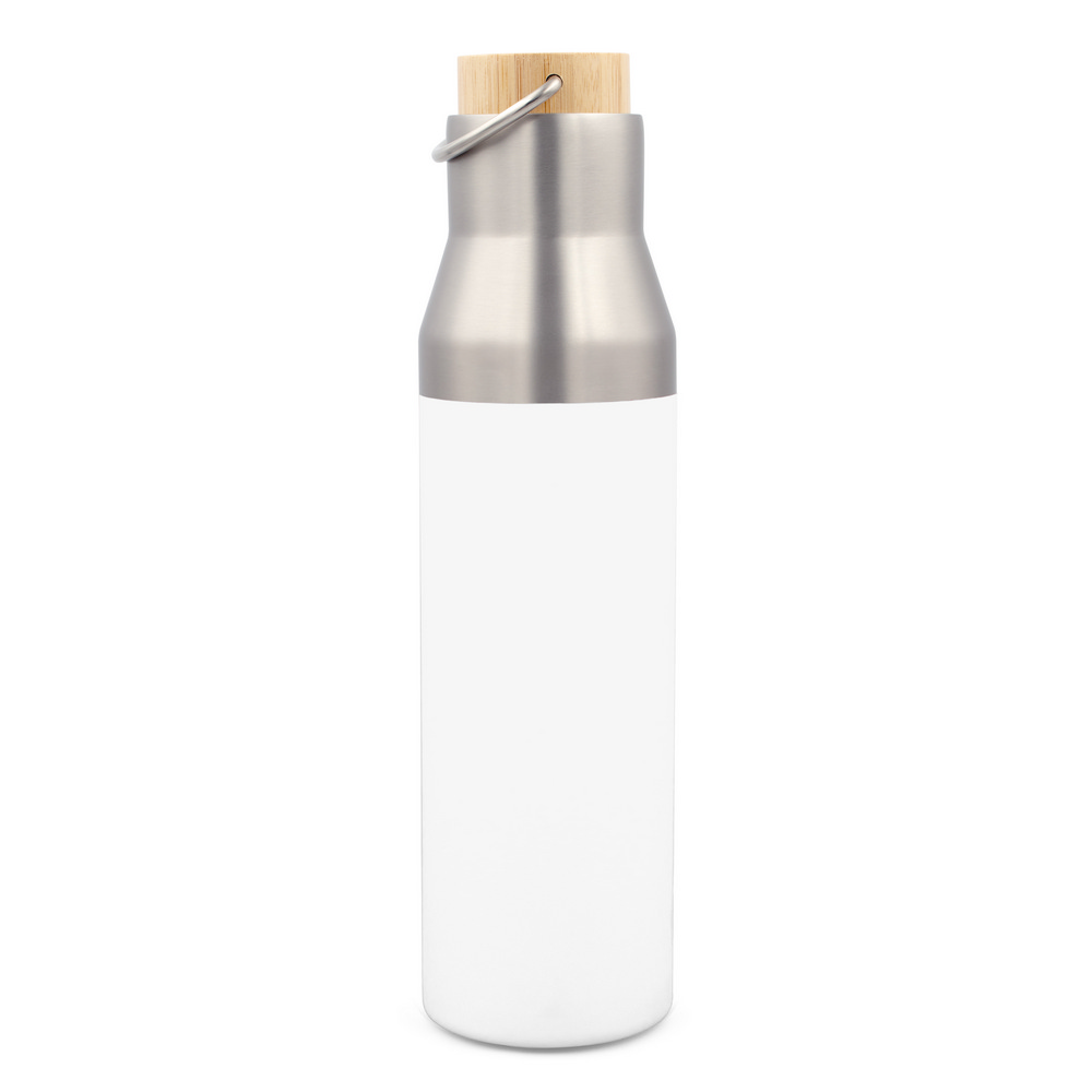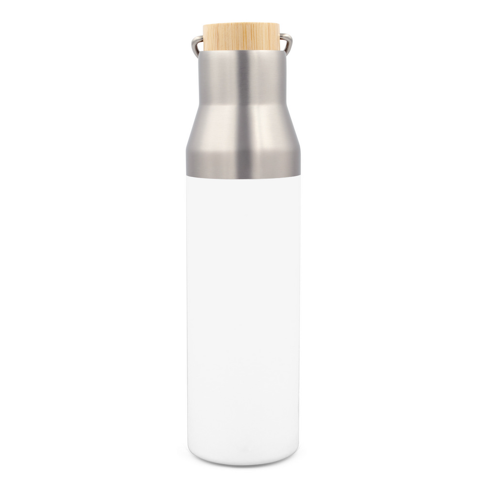 Термос-бутылка объемом 550 мл имеет двойные стенки из нержавеющей стали с вакуумным утеплителем, который замедляет выход температуры в окружающую среду, работает как термос, крышка с деталями из бамбука и металлическая ручка для удобства переноски, материалы изделия включают в себя переработанный нержавеющий металл, класс теплоизоляции: A + герметичный.