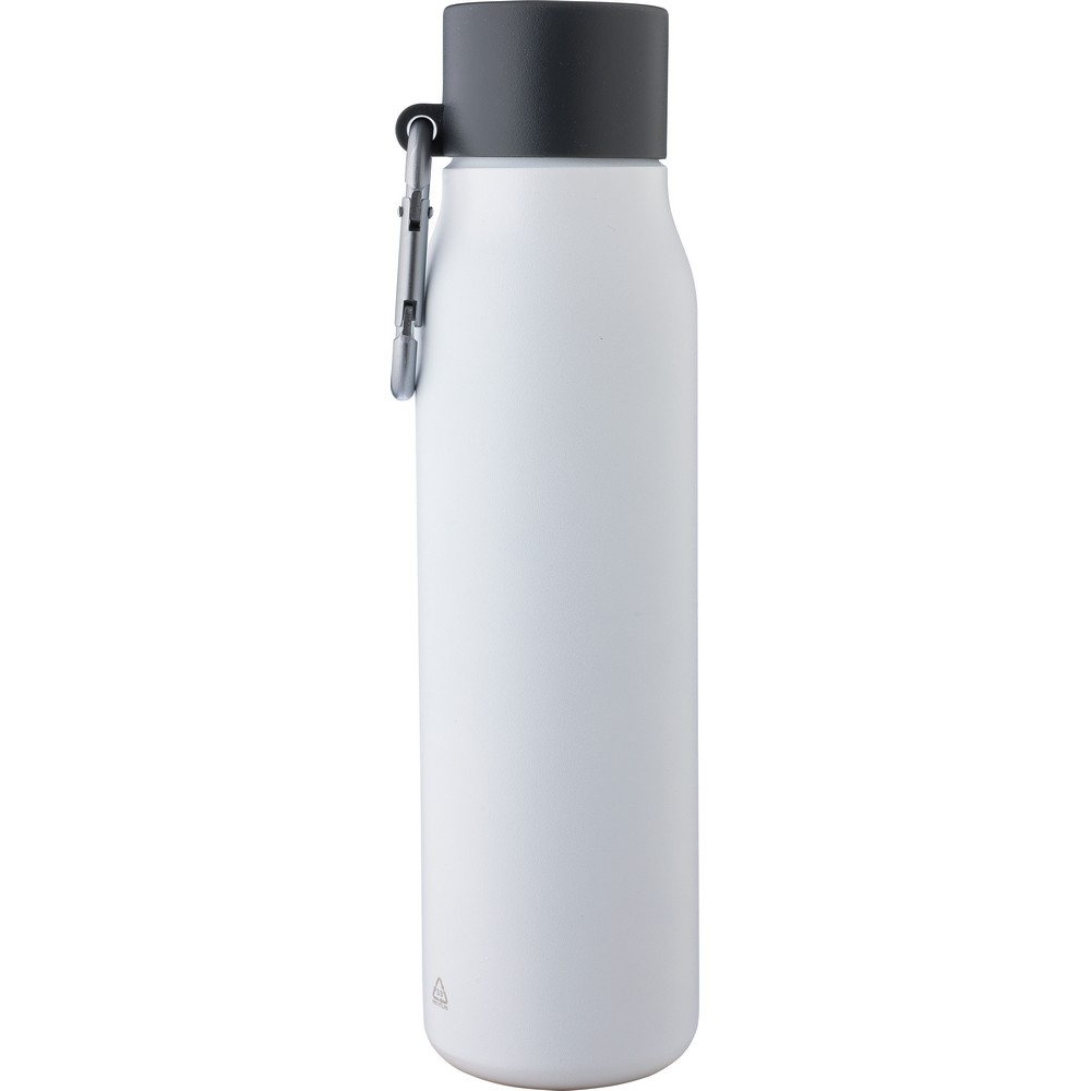 Термос бутылка объемом 600 мл с петлей для переноски, сохраняет напитки горячими до 6 часов или холодными до 9 часов, имеет значок переработки на передней части изделия, упакована индивидуально в коричневую картонную коробку, внутренняя часть изготовлена из нержавеющей стали 304, внешняя часть - из нержавеющей стали 201, оснащена герметичной черной крышкой из ПП с карабином из алюминия.