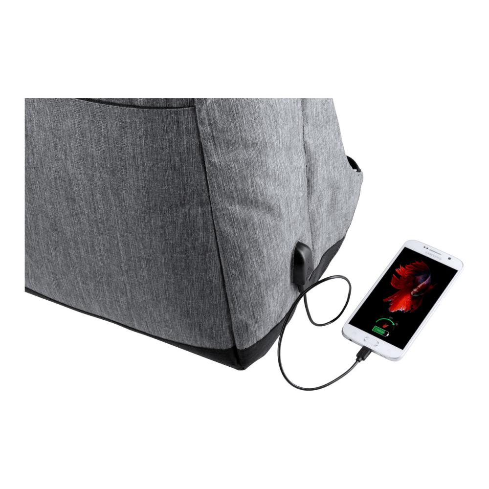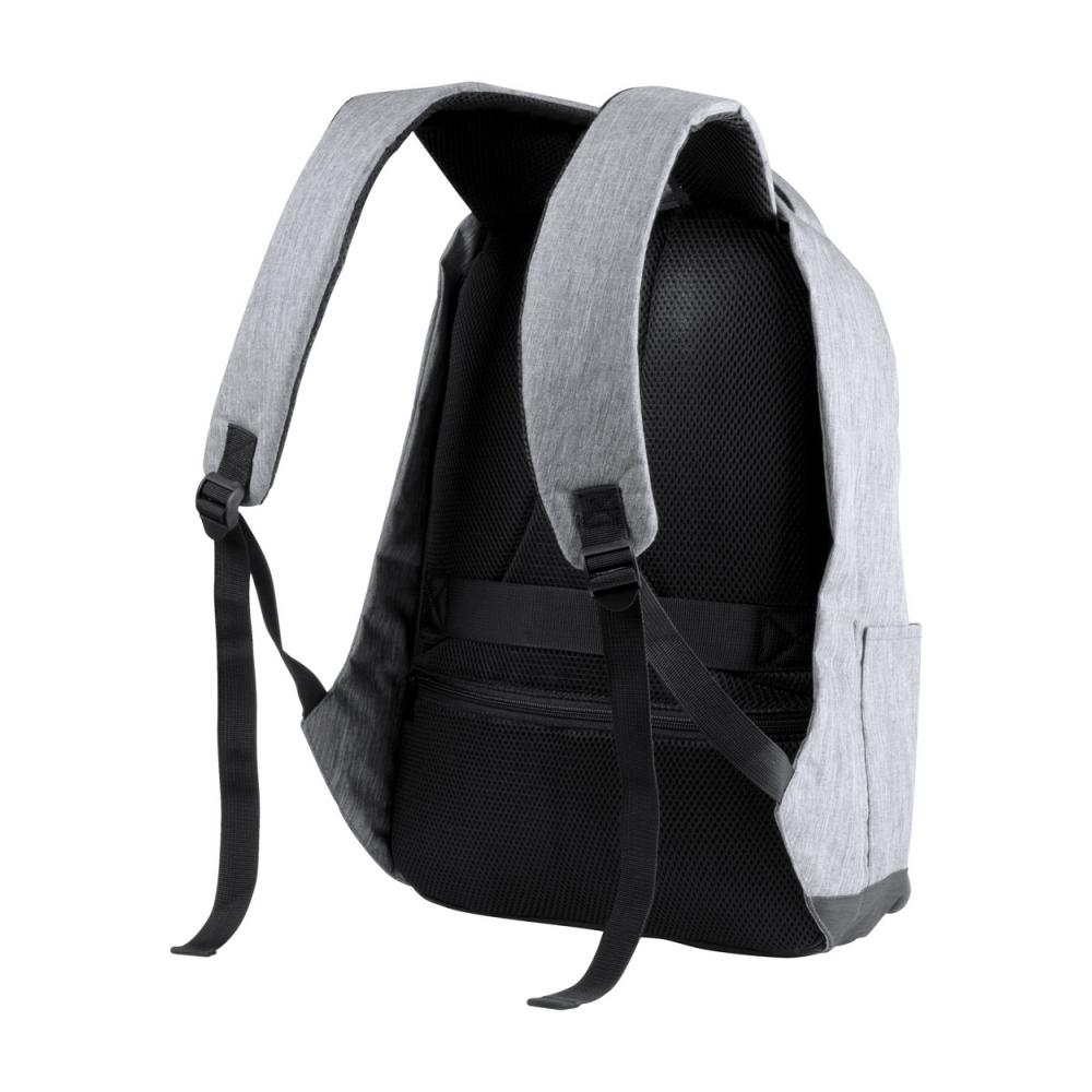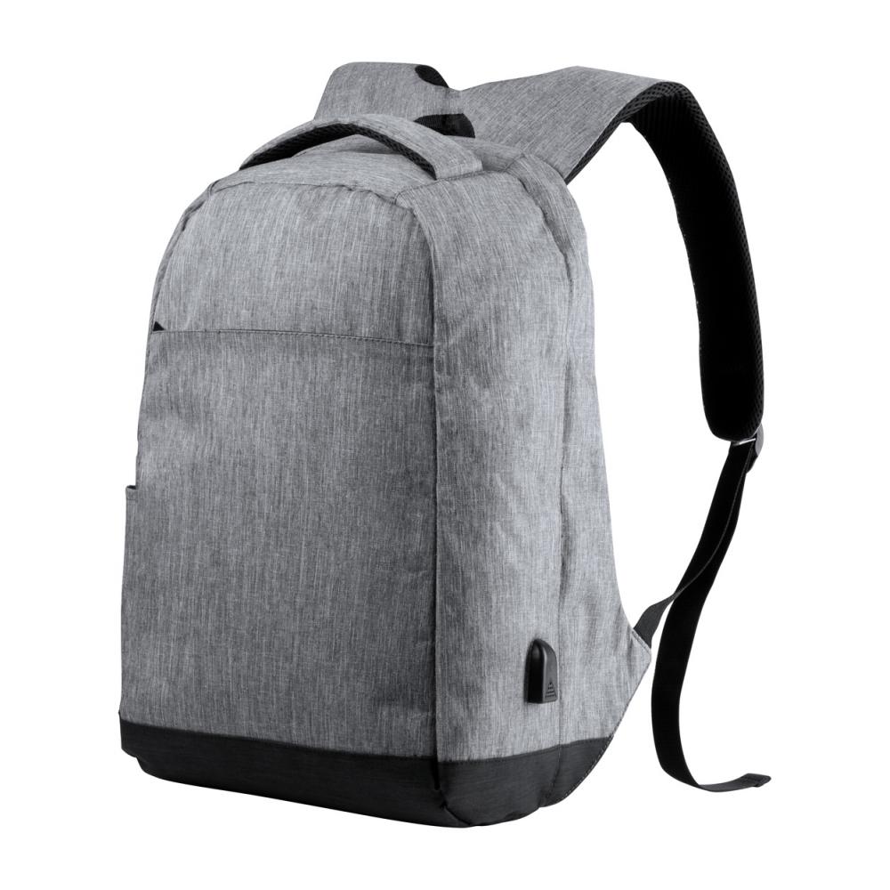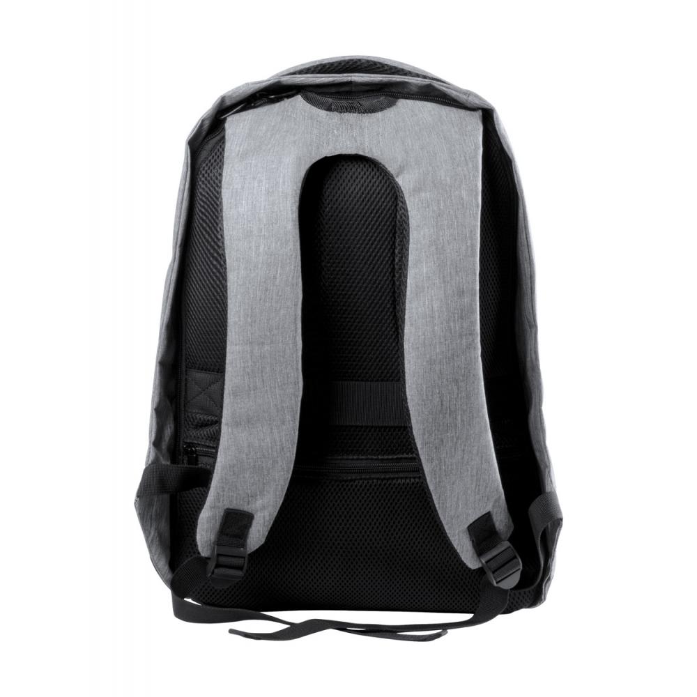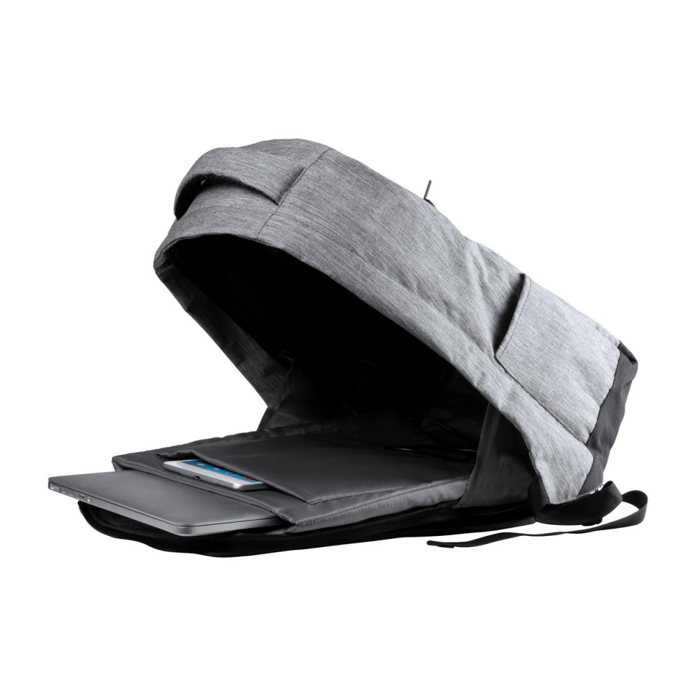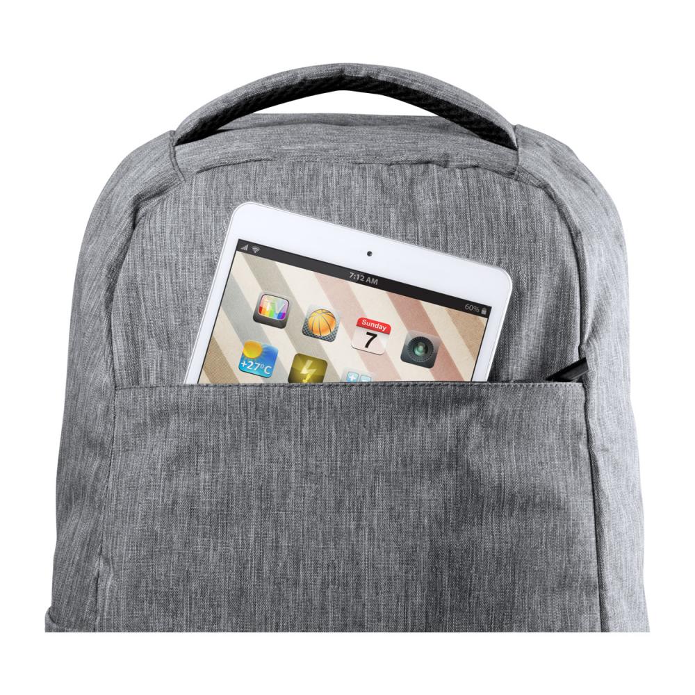 Противоугонный рюкзак с несколькими карманами, мягким отделением для ноутбука (15 дюймов) и планшета (12 дюймов), мягкой спинкой и плечевым ремнем. С ремнем для тележки и встроенным USB-разъемом для внешних аккумуляторов. Полиэстер 300D.