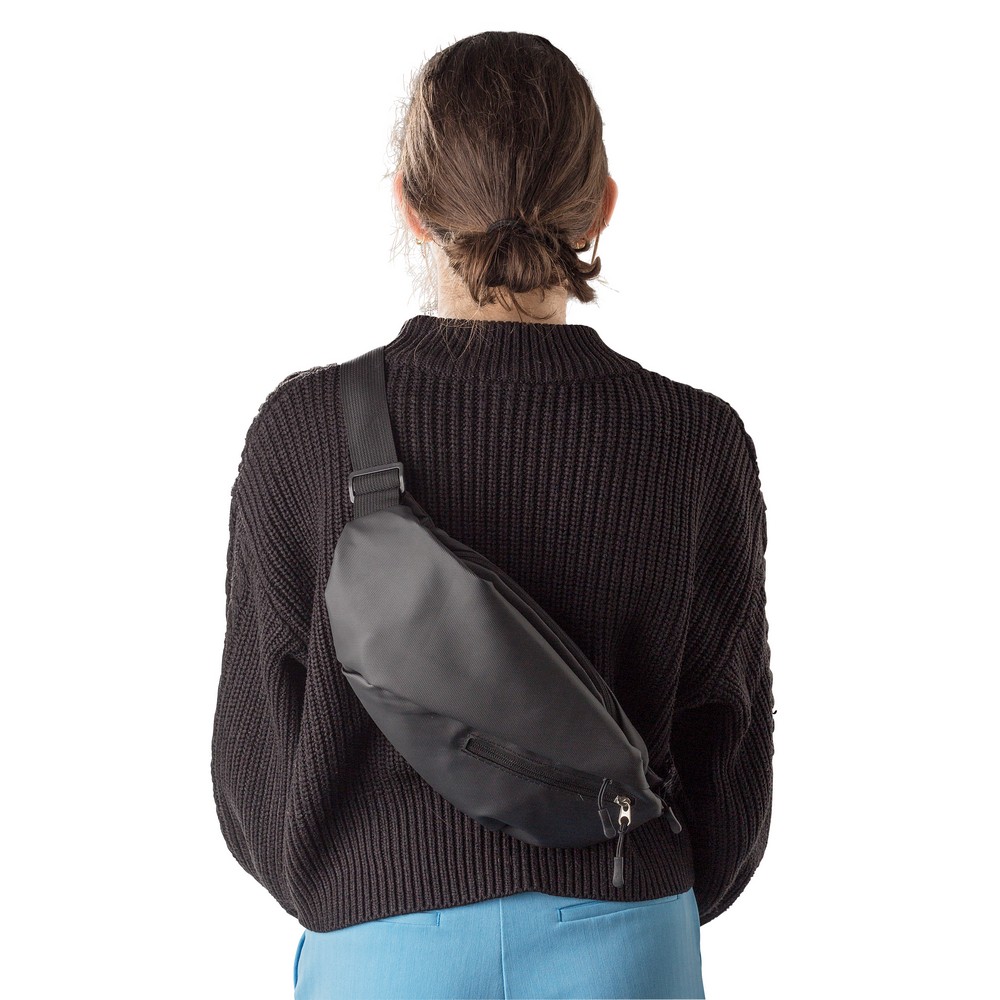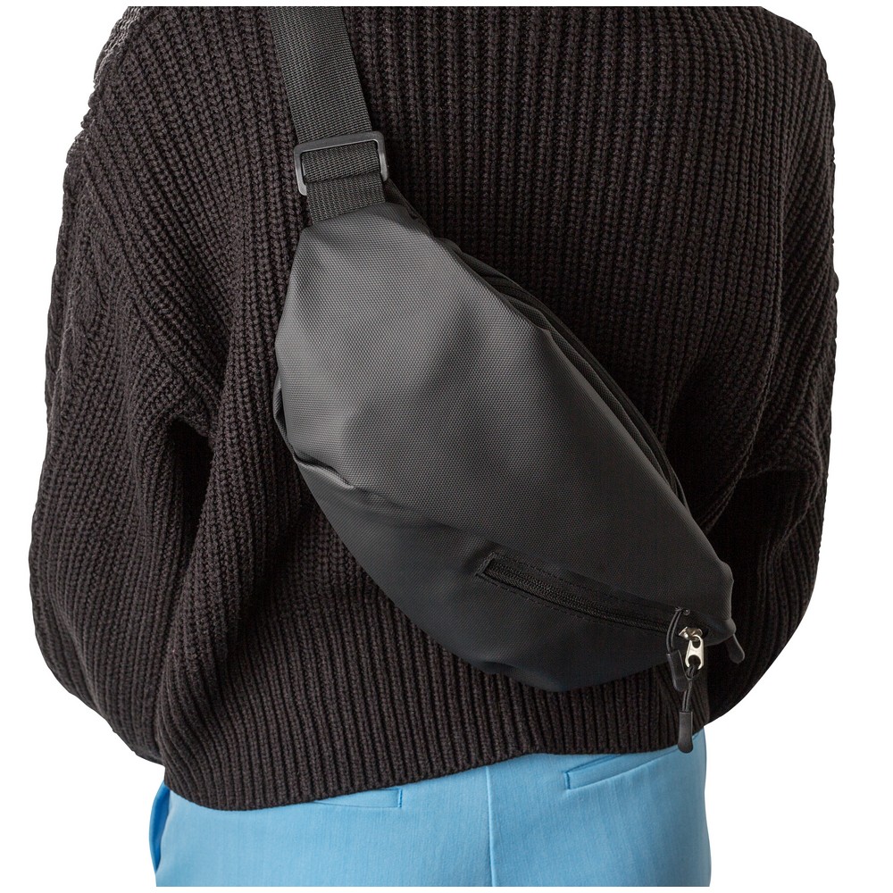 Поясная сумка с одним основным отделением, одним передним карманом на молнии, карманами внутри основного отделения, регулируемым ремешком.
