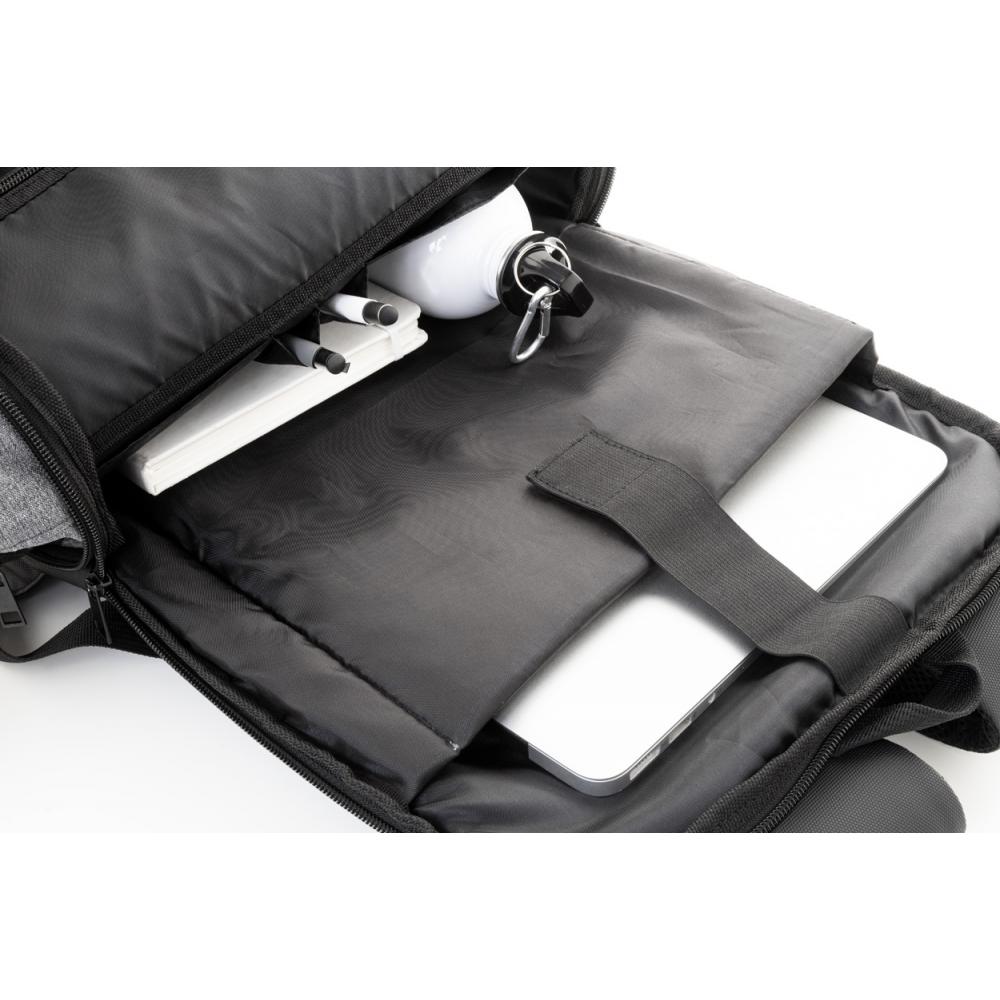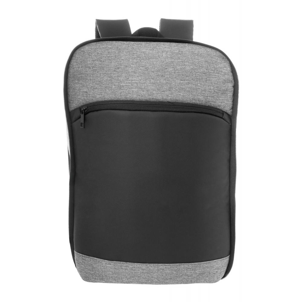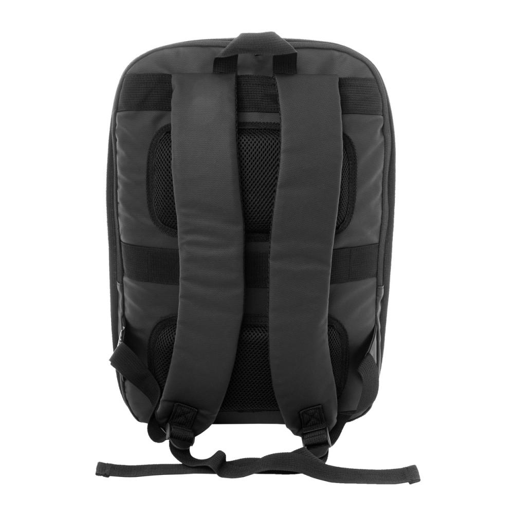 Рюкзак с расширяемым объемом, оснащенный молнией на главном отделении, молнией на переднем кармане, отделением для ноутбука (15 дюймов) с подкладкой и ПУ-покрытием на передней стороне. С ремнем для крепления к чемодану, подкладкой на спине и плечевыми ремнями. Изготовлен из 600D RPET полиэстера, с характерным ярлыком RPET.