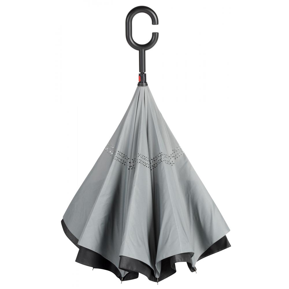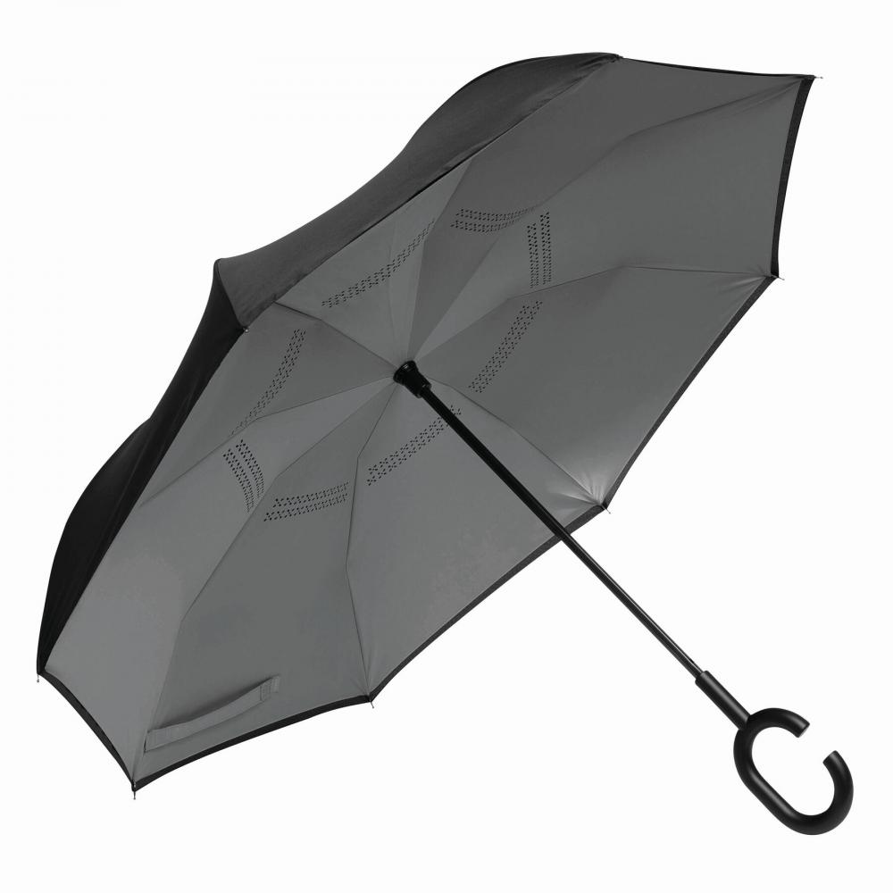Зонт-палка ОТЛОЖЕННЫЙ: с обратным механизмом открывания и закрывания, с предохранительным бегунком, свободные руки благодаря С-образной ручке, двойная крышка с вентиляционной конструкцией для предотвращения застревания воздуха, металлический стержень и ребра из стекловолокна, с металлическими наконечниками, навес из полиэстера и эпонжа, закрытие на липучке